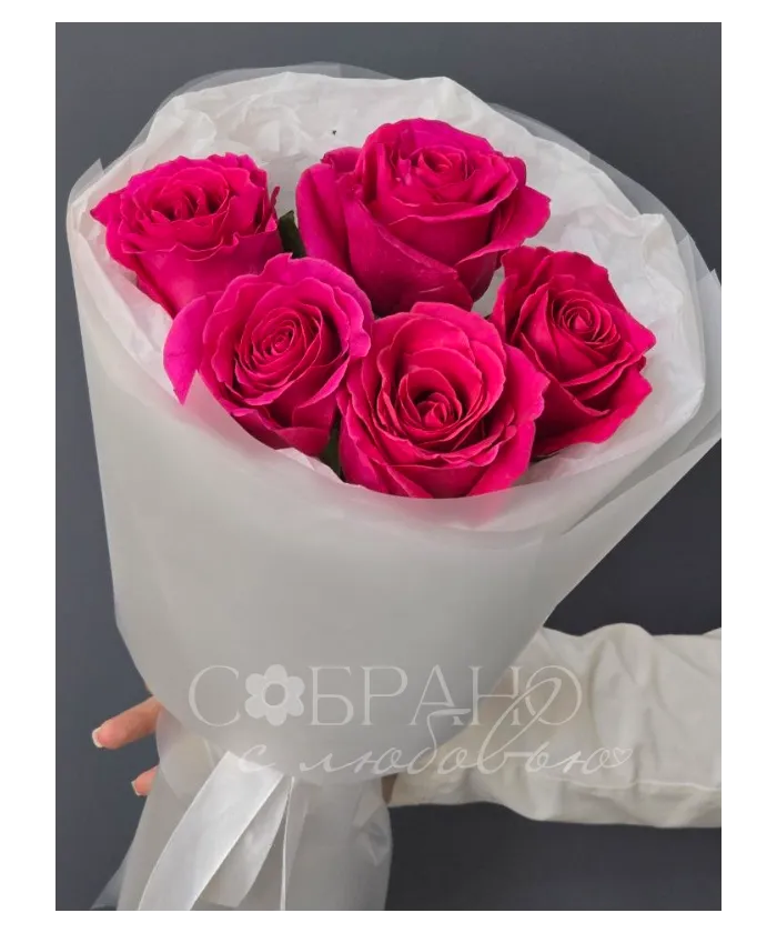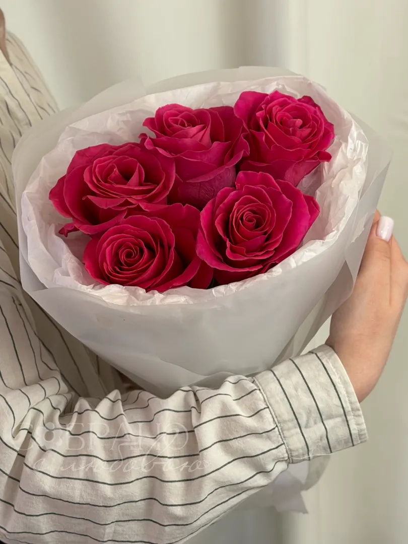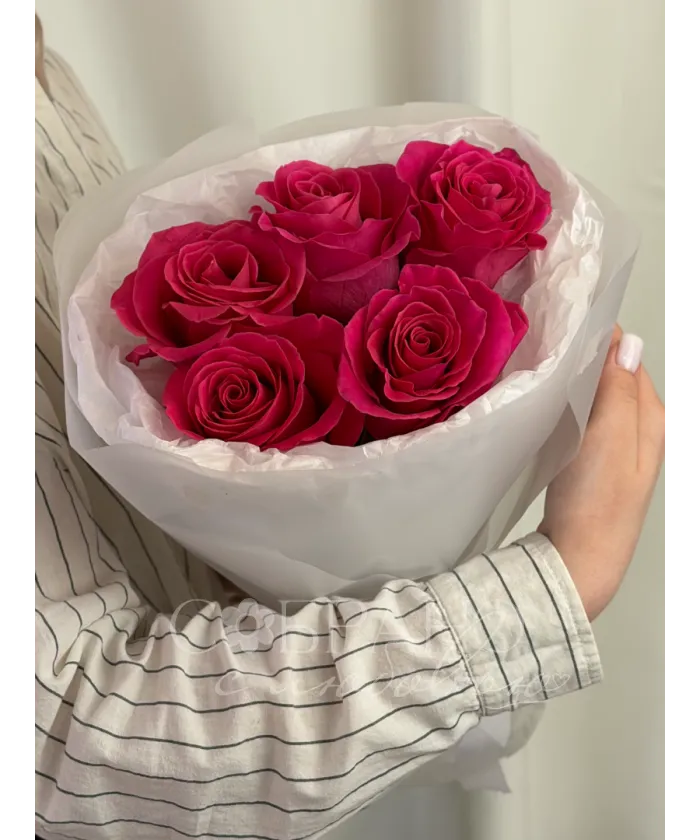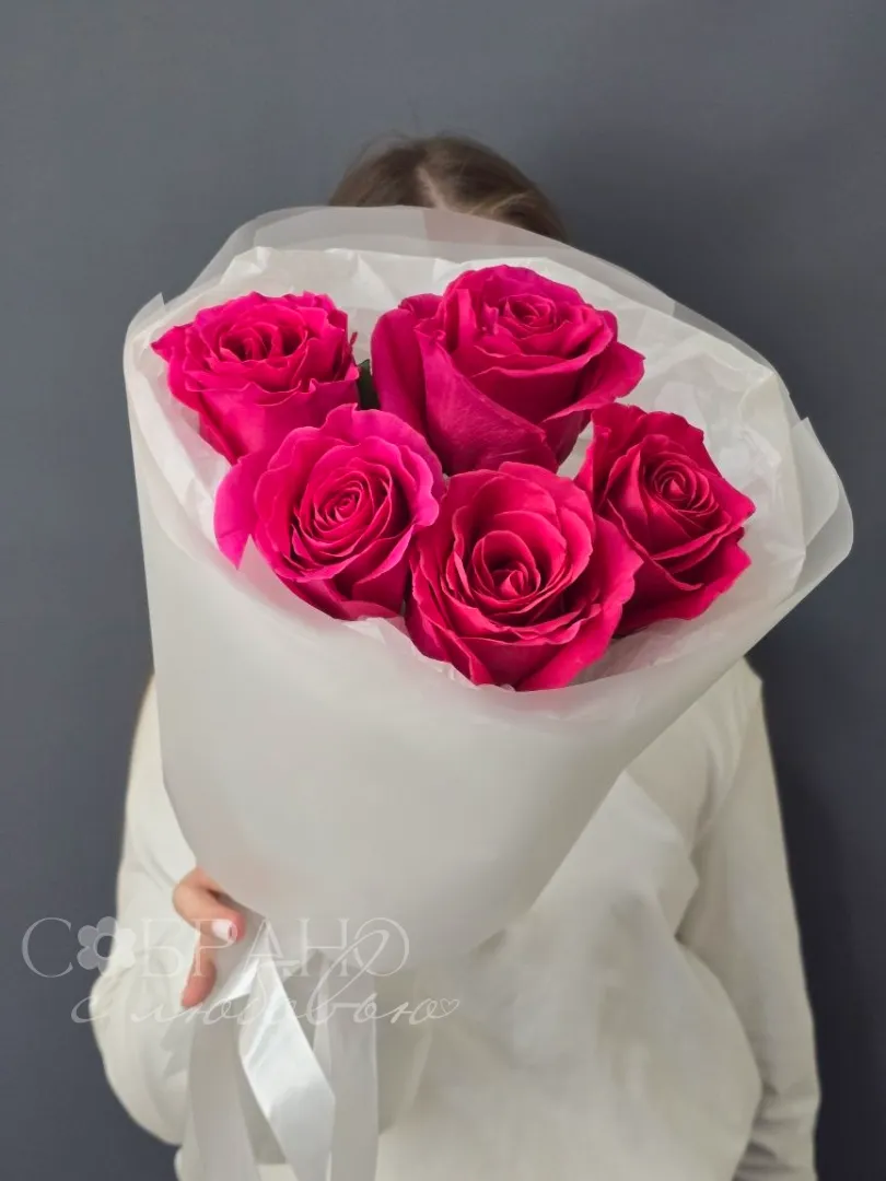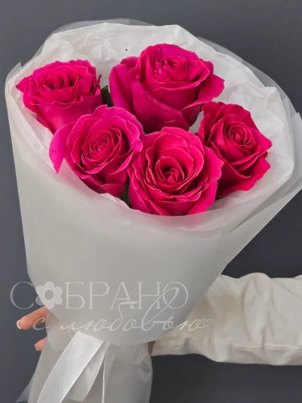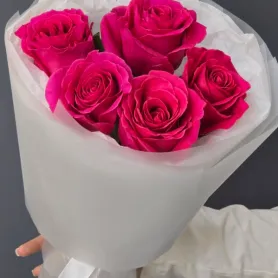 Яркий букет из пяти насыщенно-розовых роз, упакованный в нежную белую бумагу. Этот элегантный комплимент станет прекрасным выражением восхищения и искренних чувств.