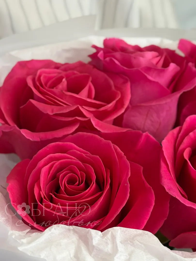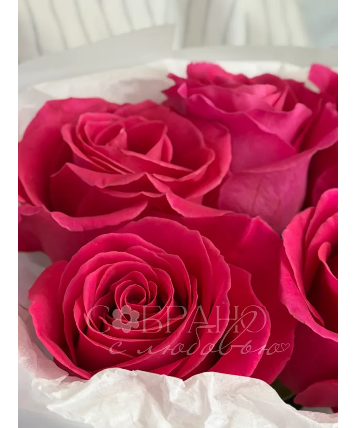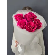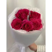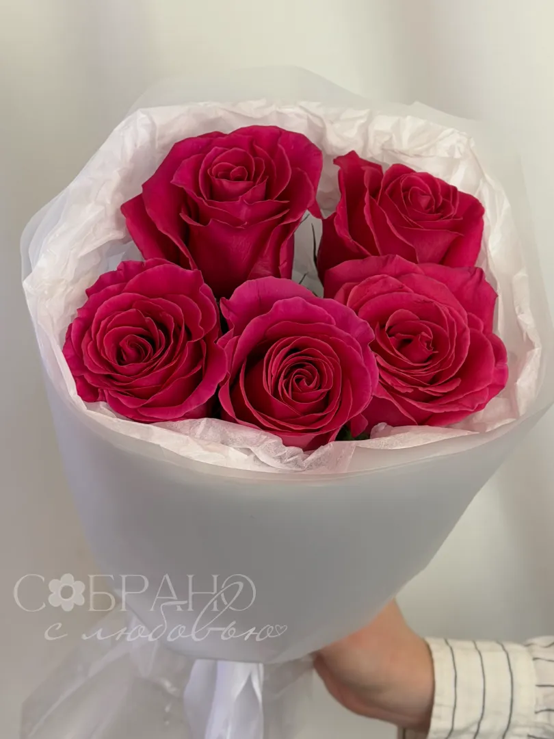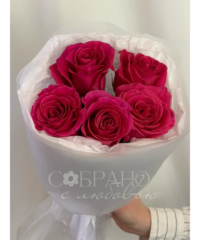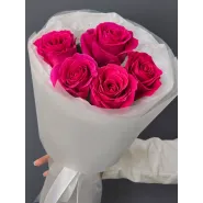 Яркий букет из пяти насыщенно-розовых роз, упакованный в нежную белую бумагу. Этот элегантный комплимент станет прекрасным выражением восхищения и искренних чувств.