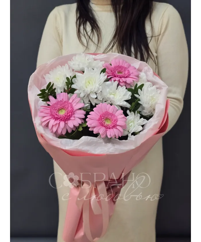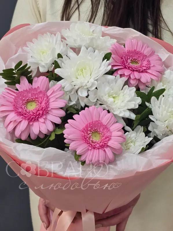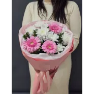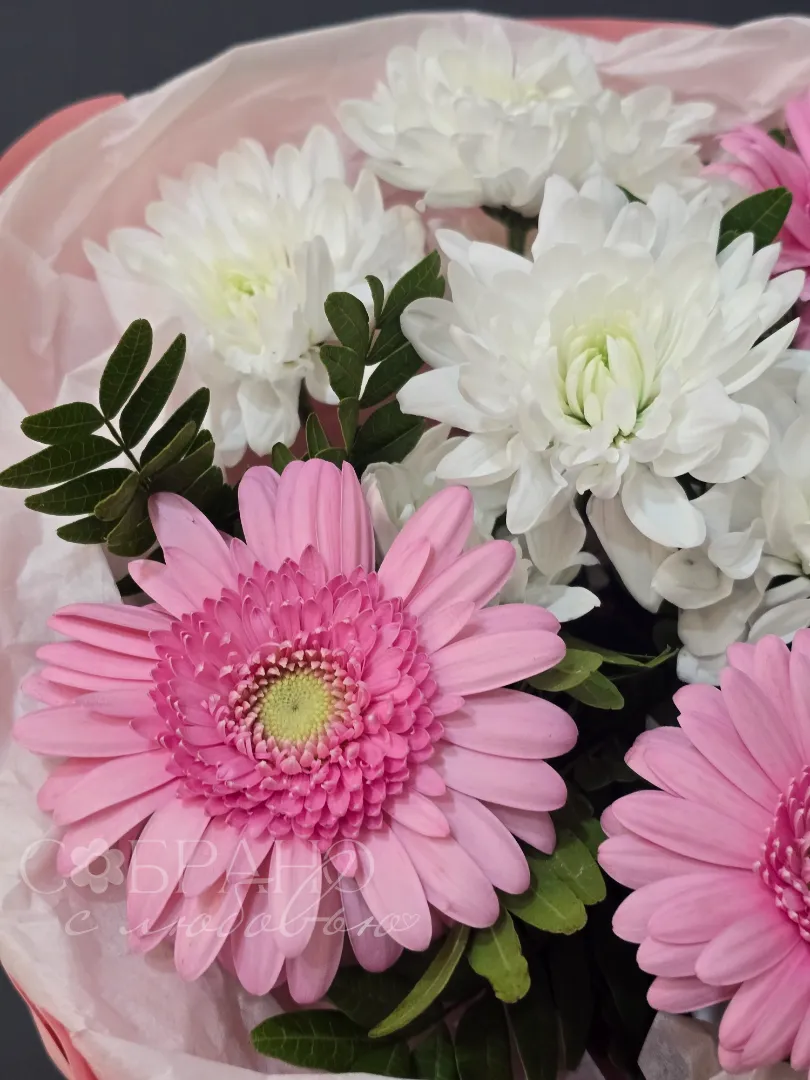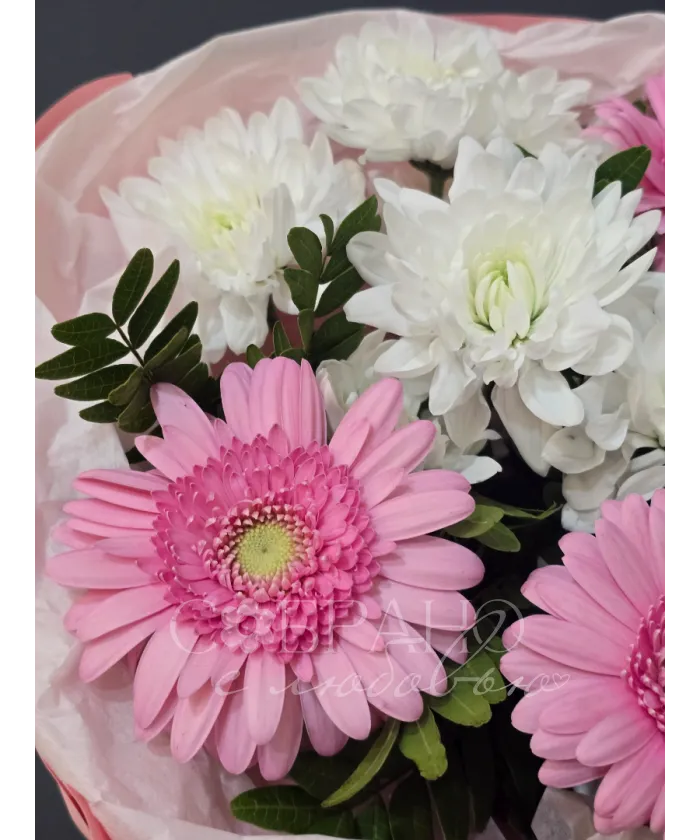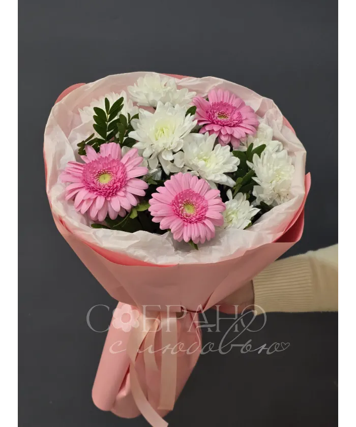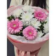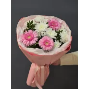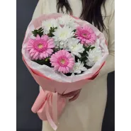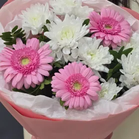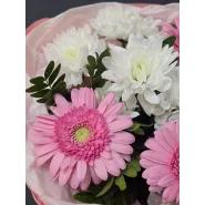 Этот букет настоящее воплощение нежности и радости. Яркие розовые герберы в сочетании с пышными белыми хризантемами создают изысканную композицию, которая подарит солнечное настроение. Идеальный выбор для выражения теплых чувств и создания праздничной атмосферы.