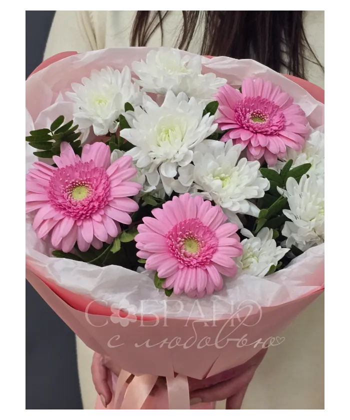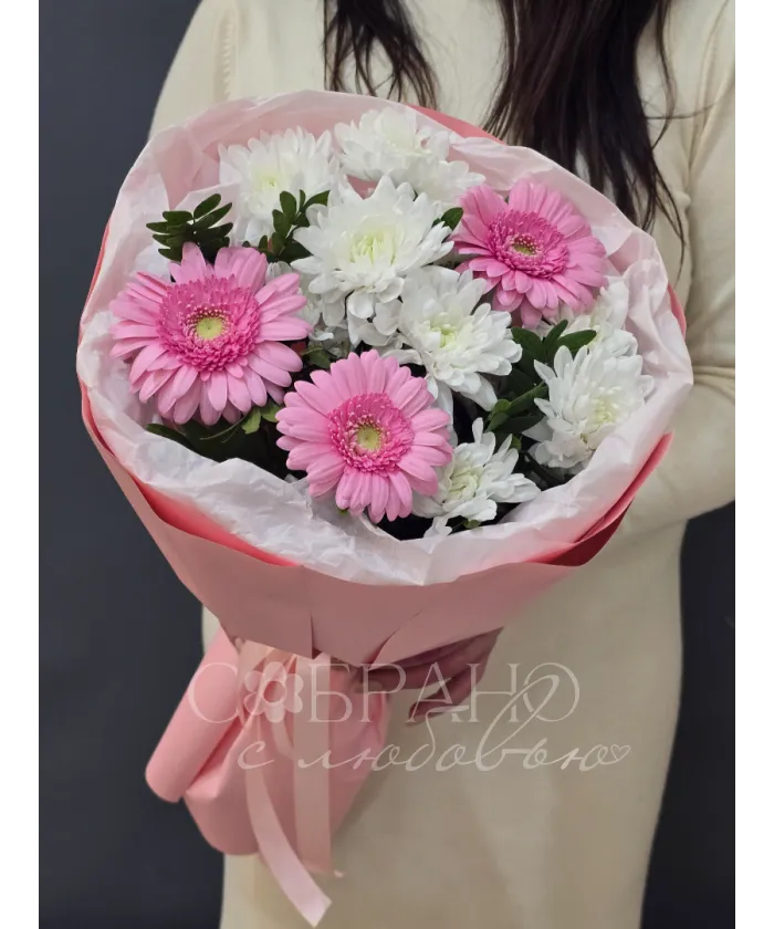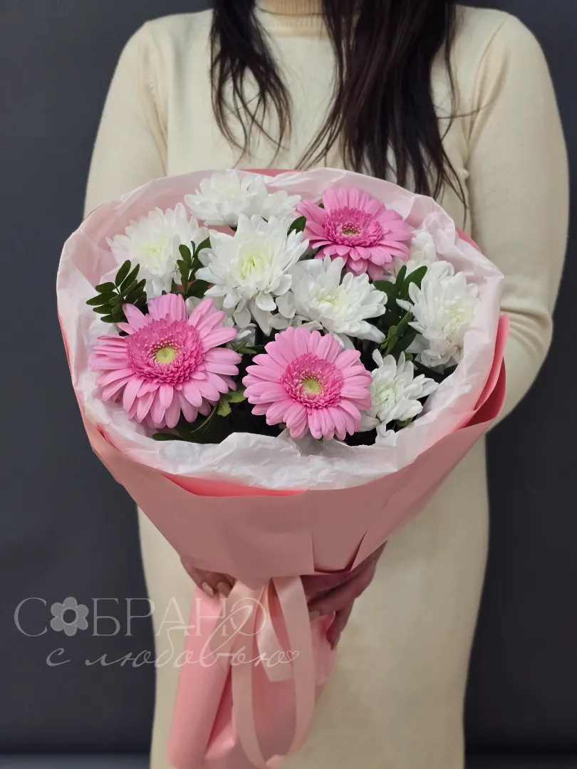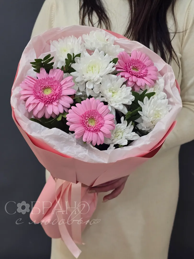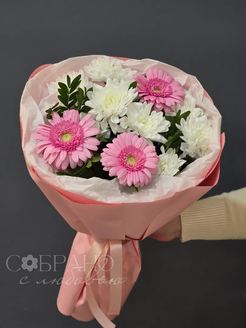 Этот букет настоящее воплощение нежности и радости. Яркие розовые герберы в сочетании с пышными белыми хризантемами создают изысканную композицию, которая подарит солнечное настроение. Идеальный выбор для выражения теплых чувств и создания праздничной атмосферы.