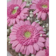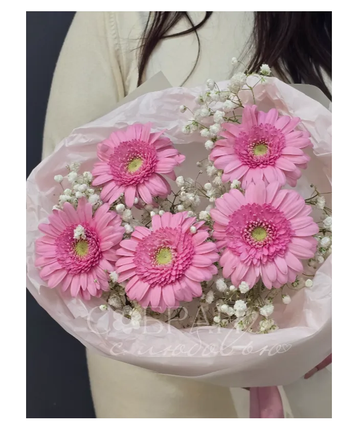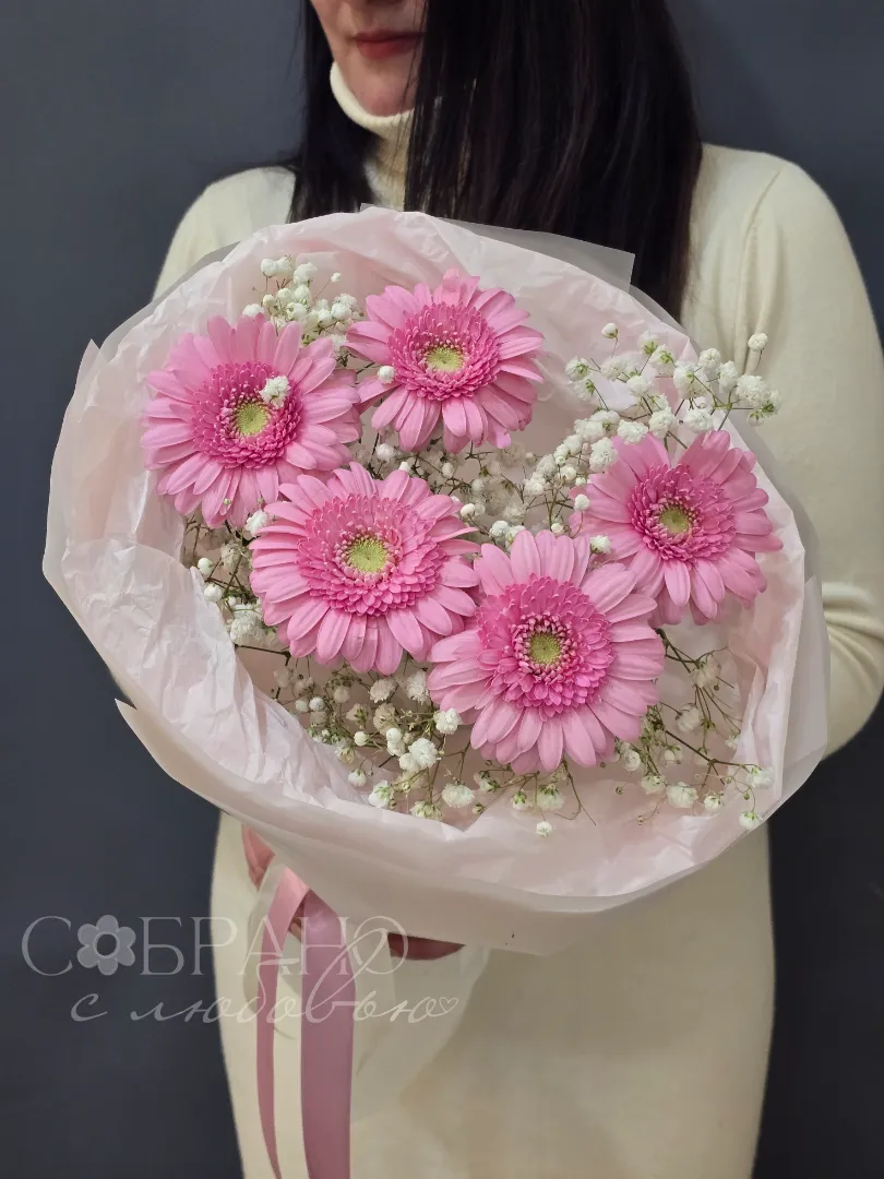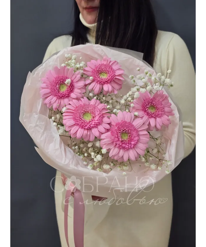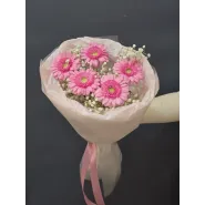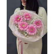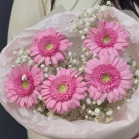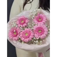 Нежный букет из пяти ярко-розовых гербер, окруженных воздушной гипсофилой, словно лучик солнечного света. Этот яркий акцент подарит радость и поднимет настроение.