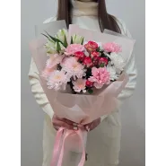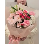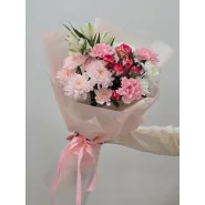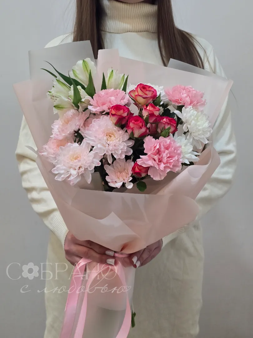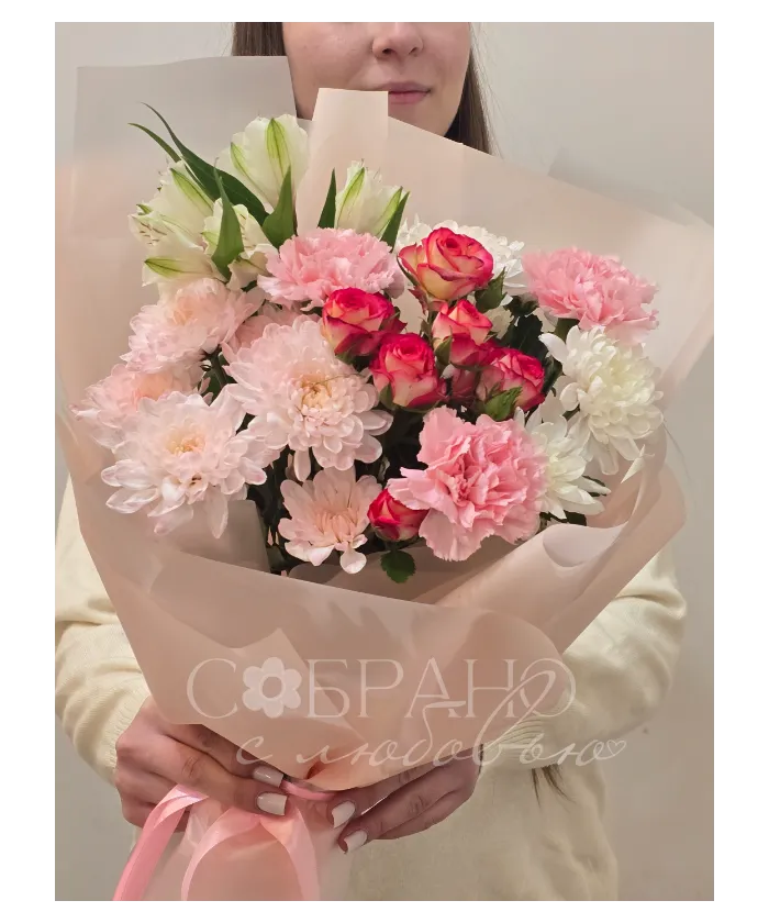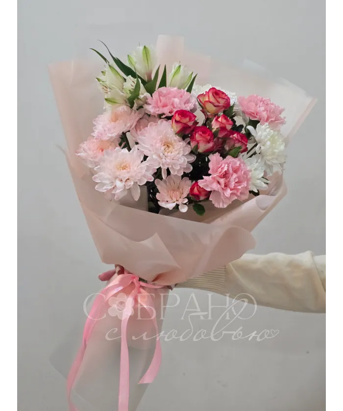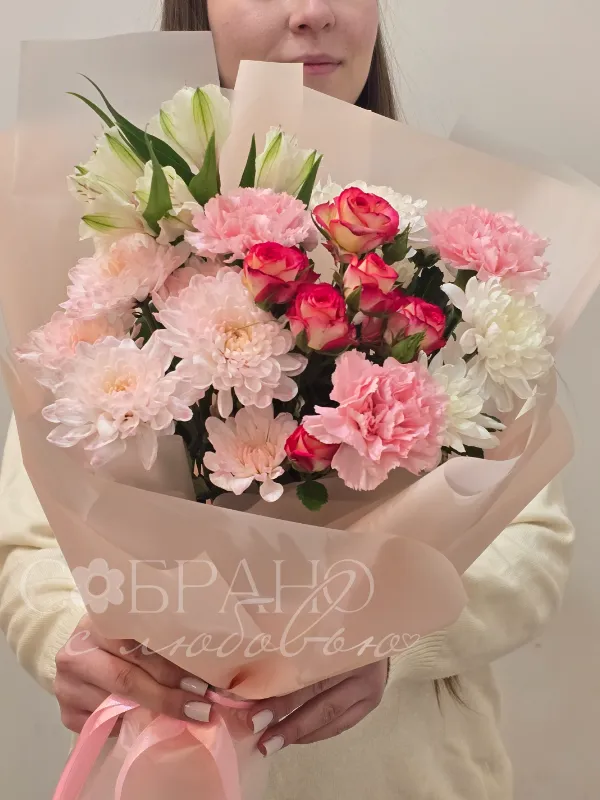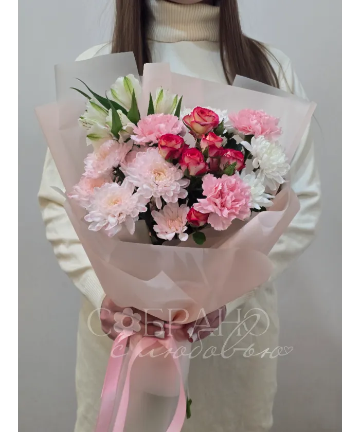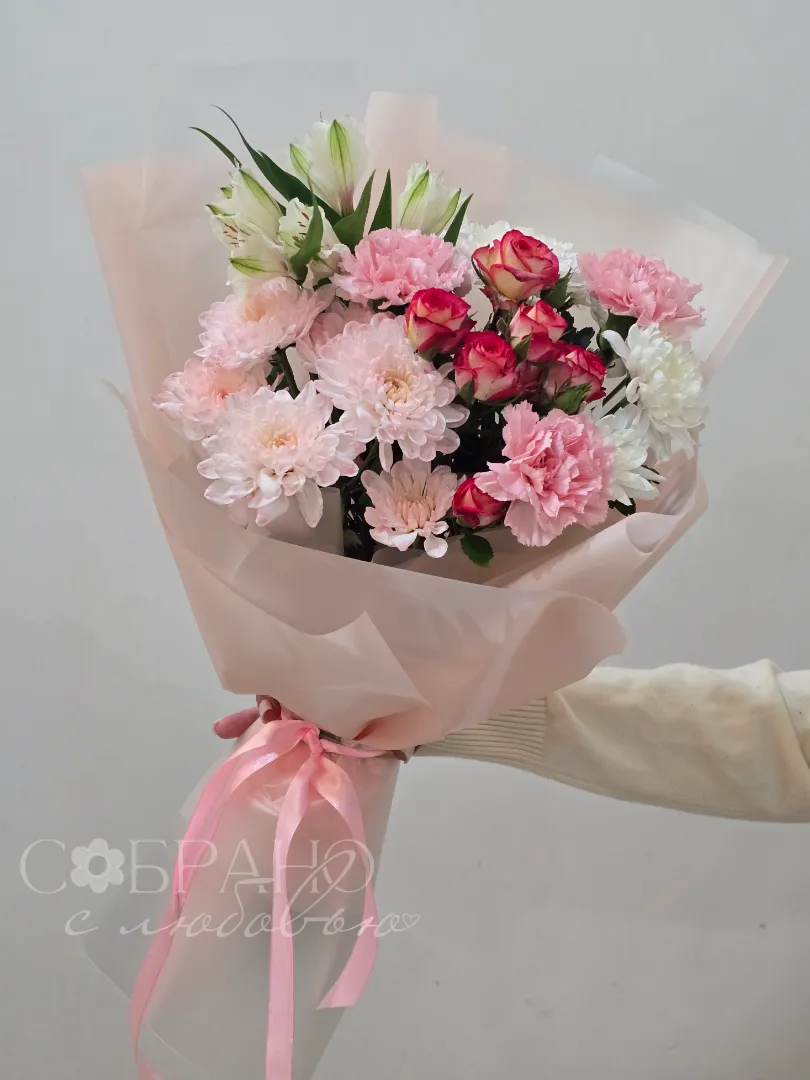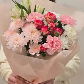 Нежный букет в пастельных тонах, сочетающий в себе изящные розы, пышные хризантемы и воздушные альстромерии. Этот цветочный ансамбль, окутанный в персиковый пергамент, станет идеальным подарком, который наполнит день получателя теплом и радостью.