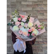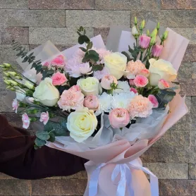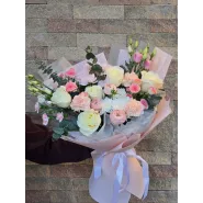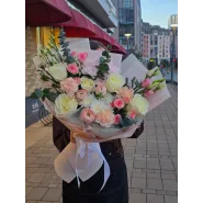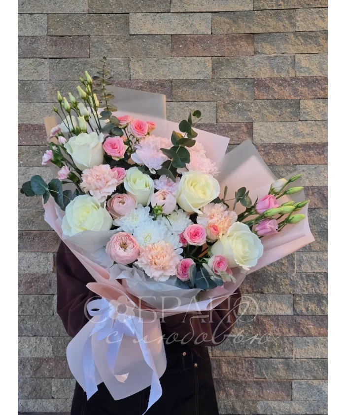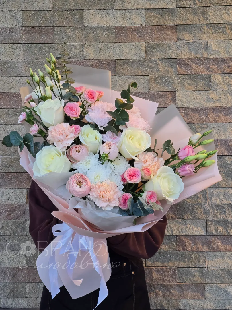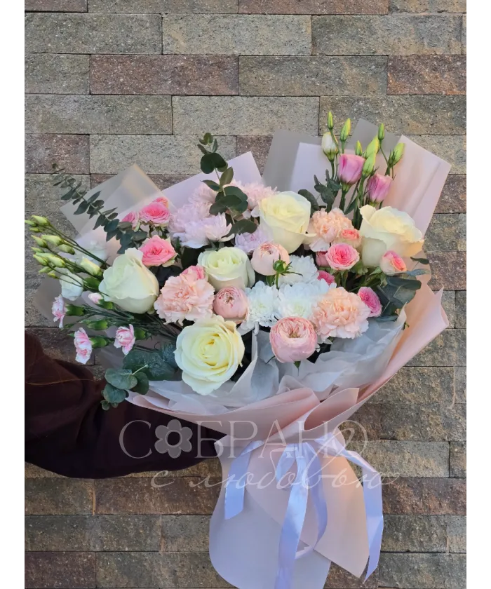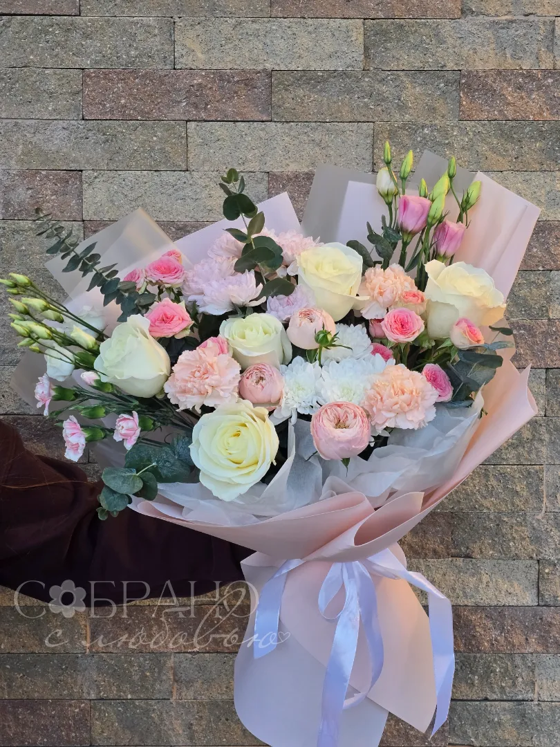 Нежные пионовидные розы и благородные розы в сочетании с пышными кустовыми хризантемами и изящной эустомой создают неповторимый образ.