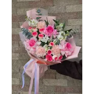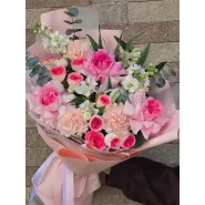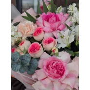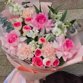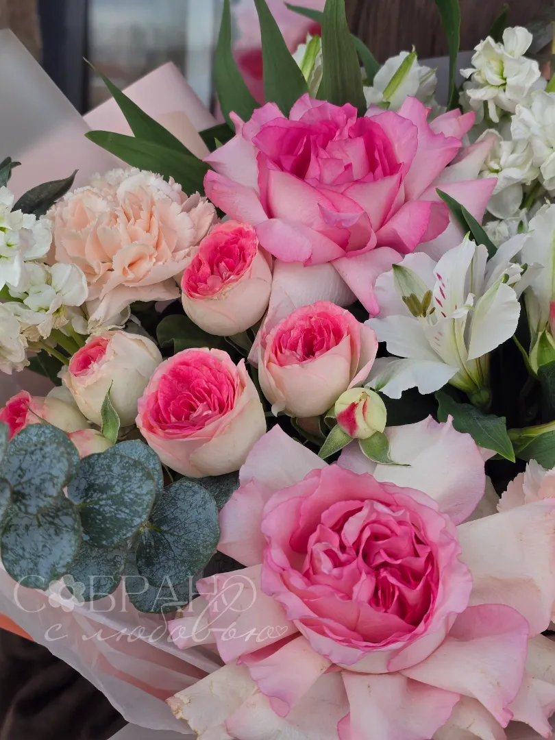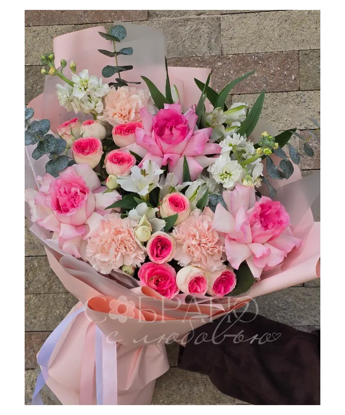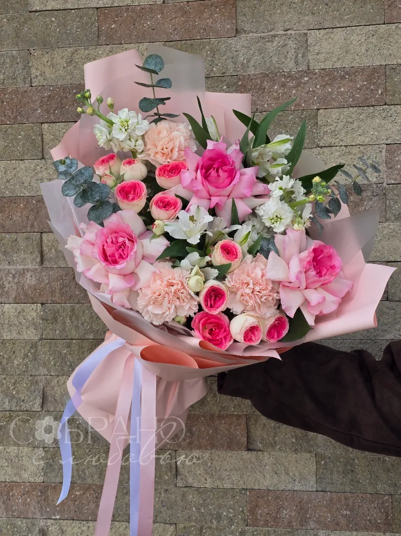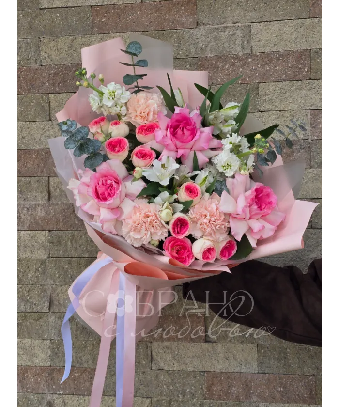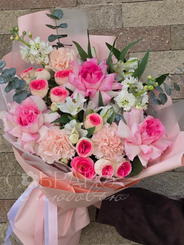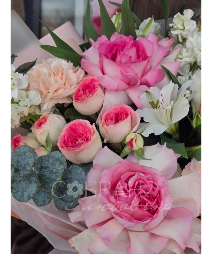 Нежный букет в оттенках розового и кремового, созданный из пышных роз, воздушных гвоздик и изящных альстромерий. Этот флористический шедевр, дополненный эвкалиптом, излучает романтику и очарование.