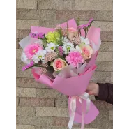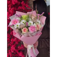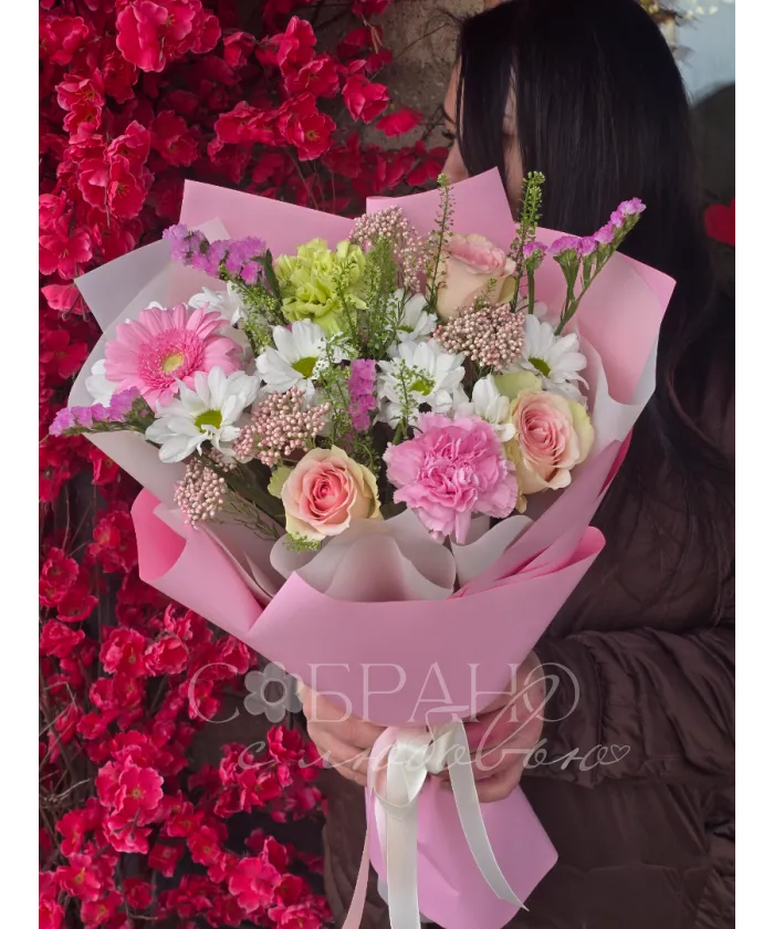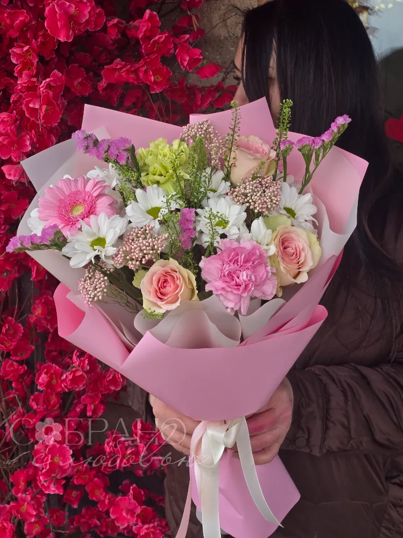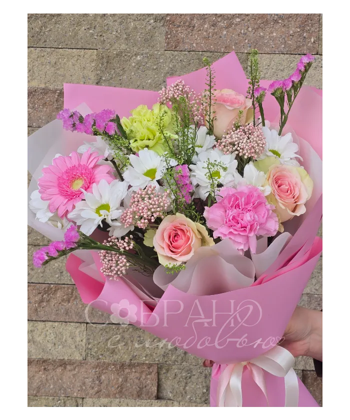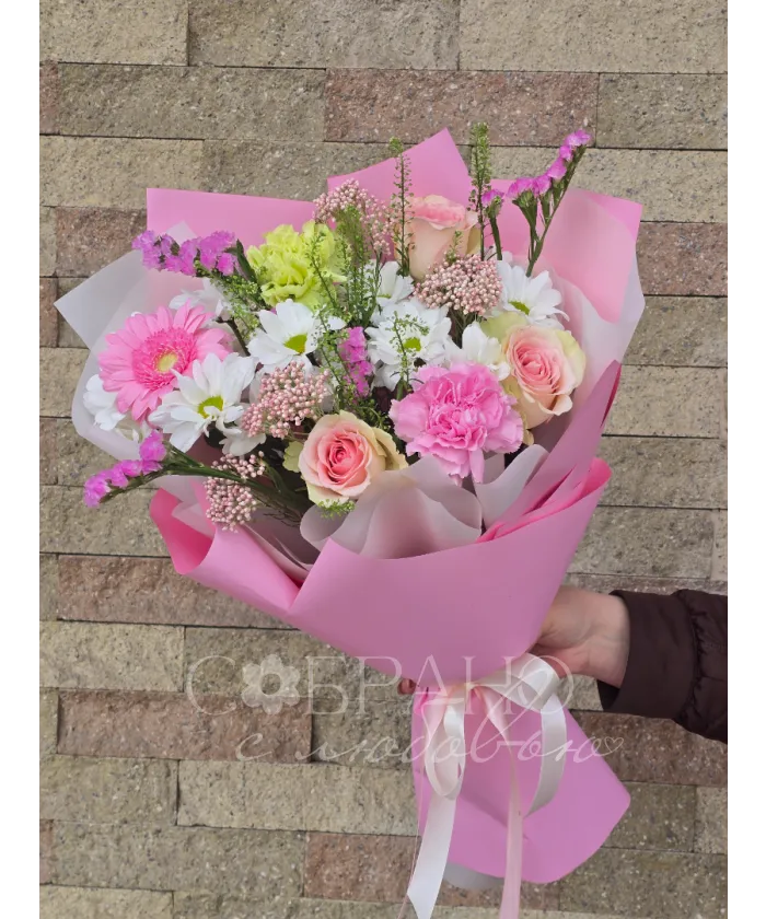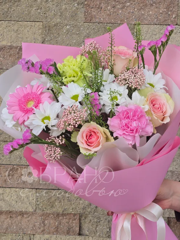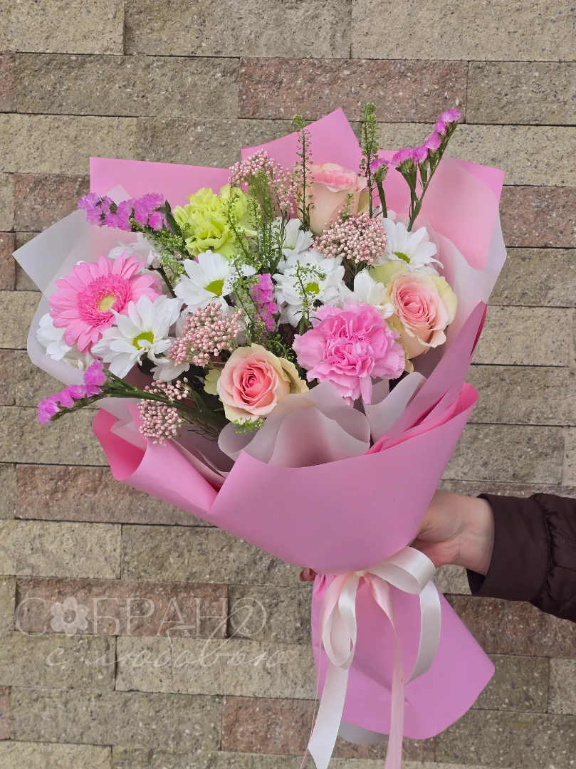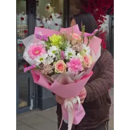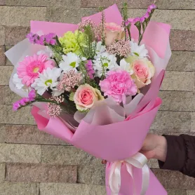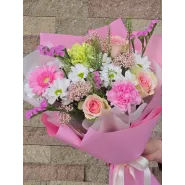 Нежный букет из роз, гербер и хризантем в розовой упаковке. Этот букет создан, чтобы подарить тепло и радость.