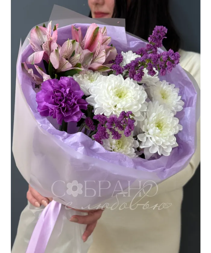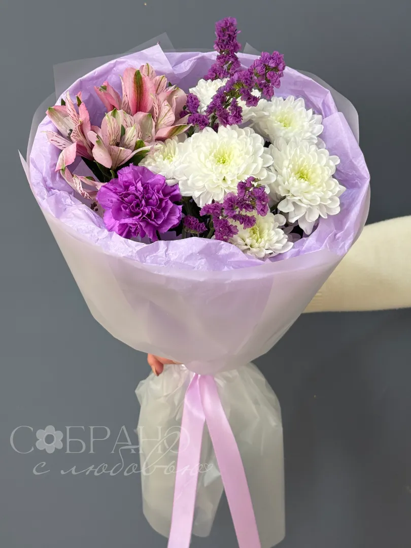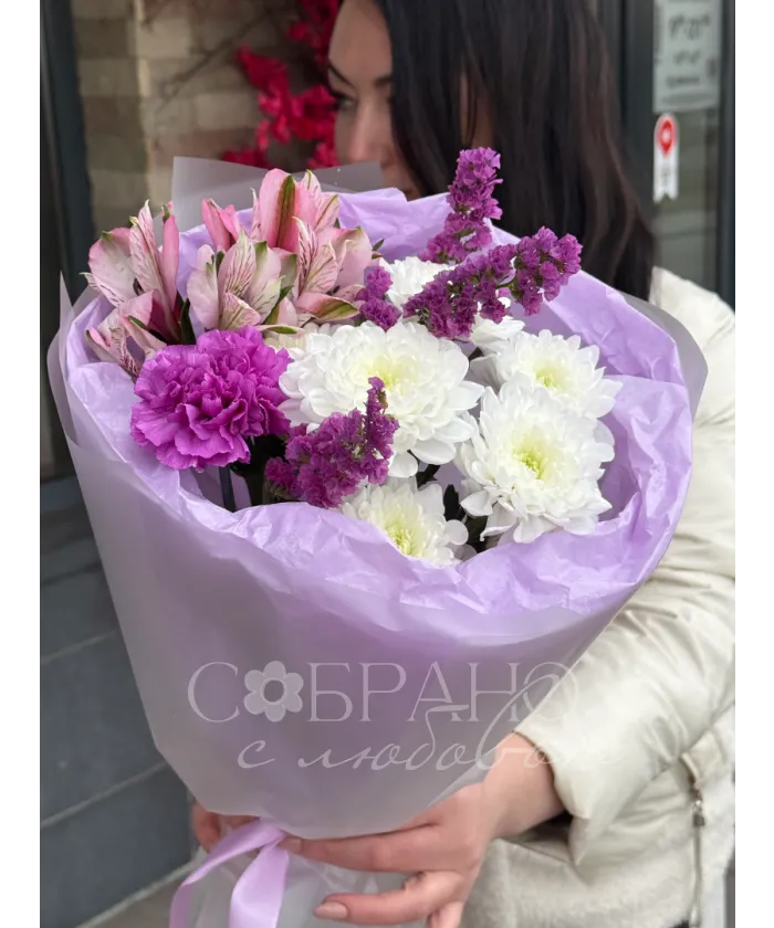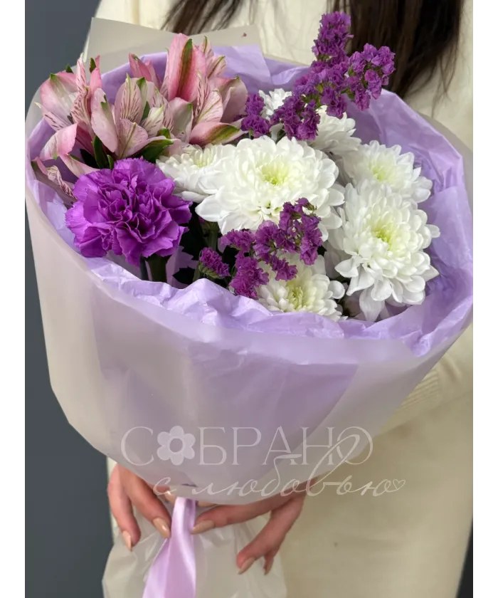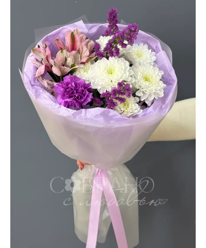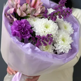 Нежность и свежесть сплелись в этом букете, очаровывая своими переливами. Белоснежные хризантемы, розовые альстромерии и фиолетовые гвоздики, дополненные воздушным статице, создают гармоничную композицию. Этот букет станет прекрасным подарком, наполненным утонченной красотой и весенним настроением.