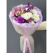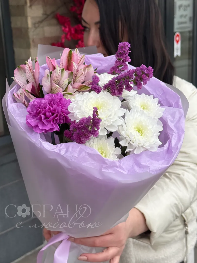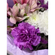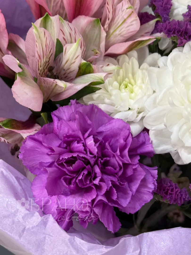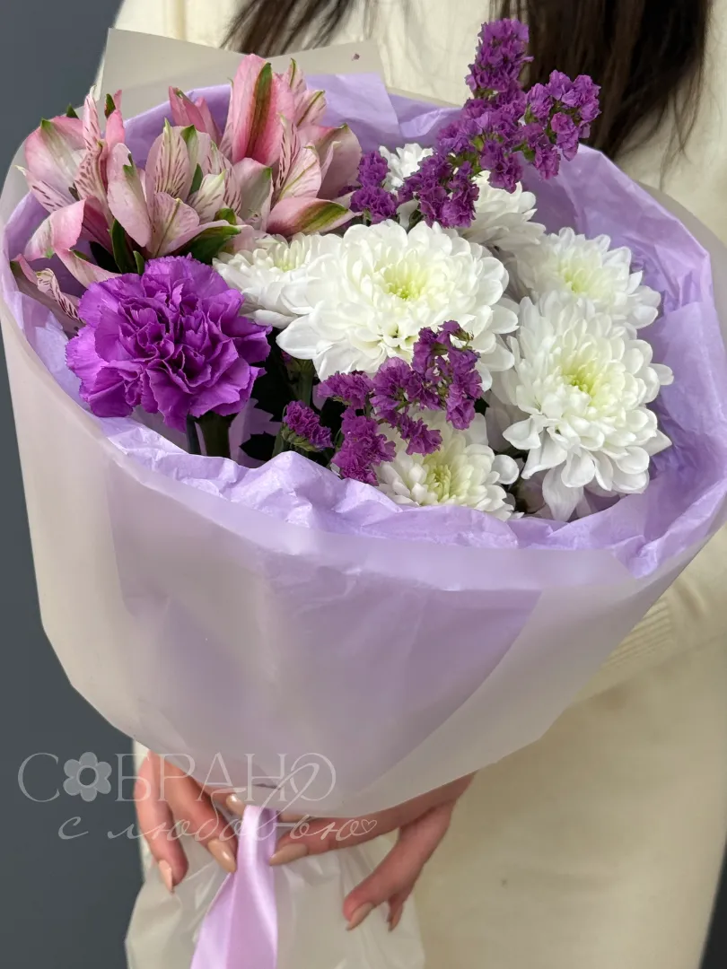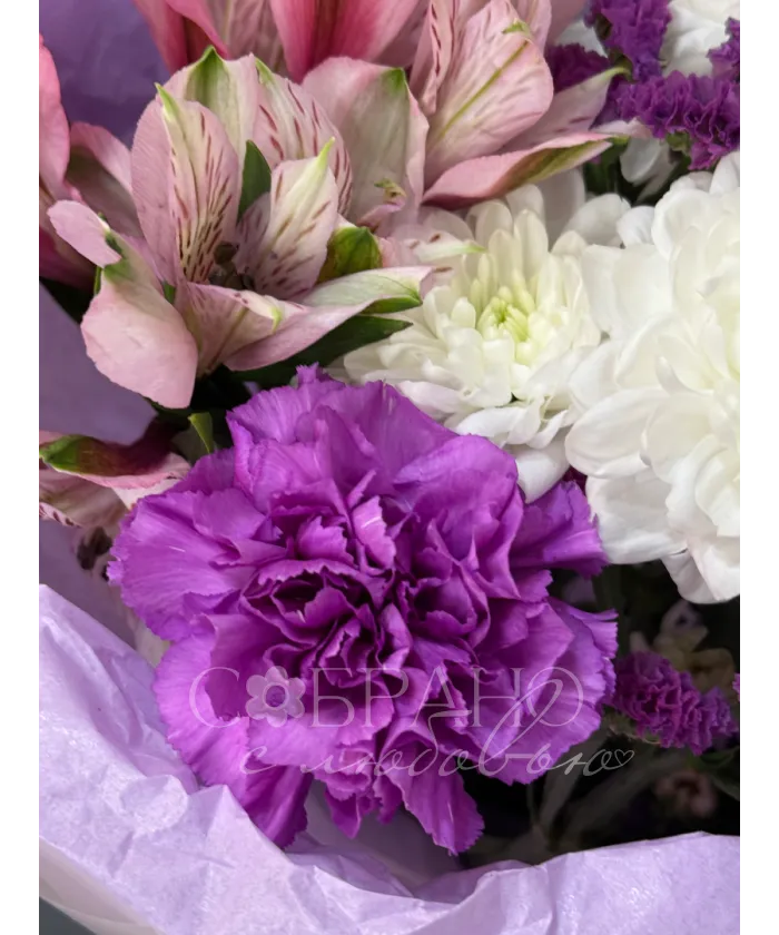 Нежность и свежесть сплелись в этом букете, очаровывая своими переливами. Белоснежные хризантемы, розовые альстромерии и фиолетовые гвоздики, дополненные воздушным статице, создают гармоничную композицию. Этот букет станет прекрасным подарком, наполненным утонченной красотой и весенним настроением.