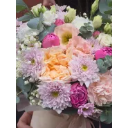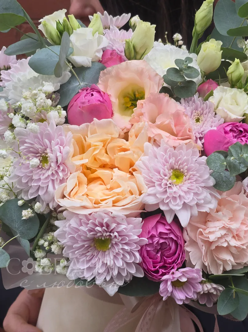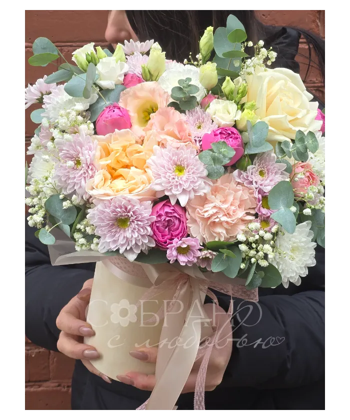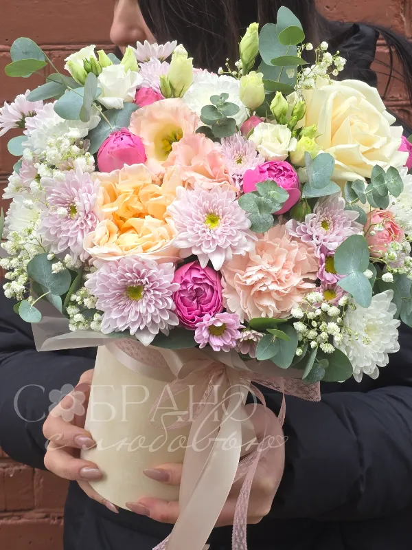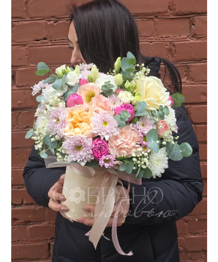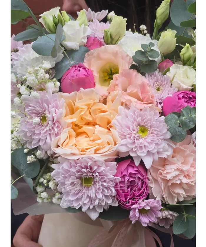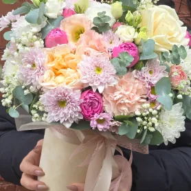 Очаровательный букет в нежных пастельных тонах это настоящее воплощение весеннего пробуждения. Воздушные пионы, изящные розы и ажурная гипсофила создают неповторимую композицию, наполненную ароматом счастья. Этот букет станет прекрасным подарком, который подарит нежность и радость.
