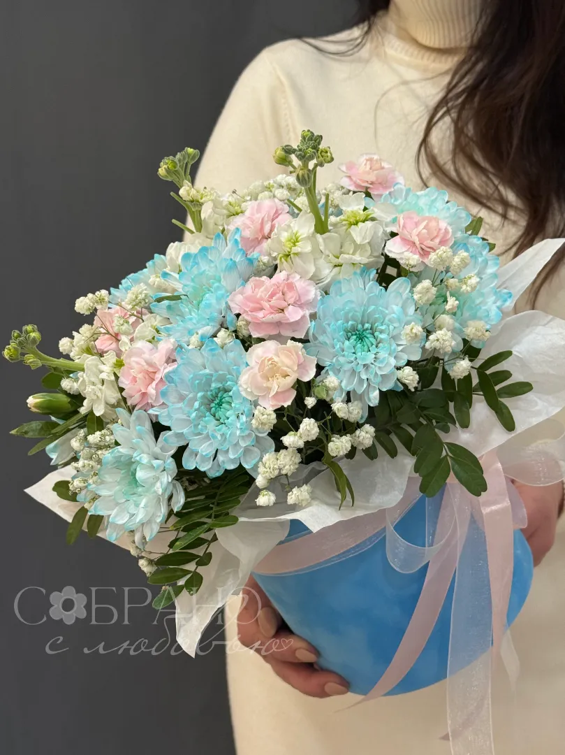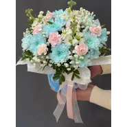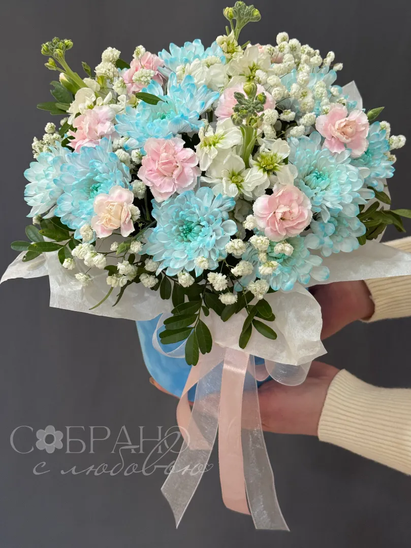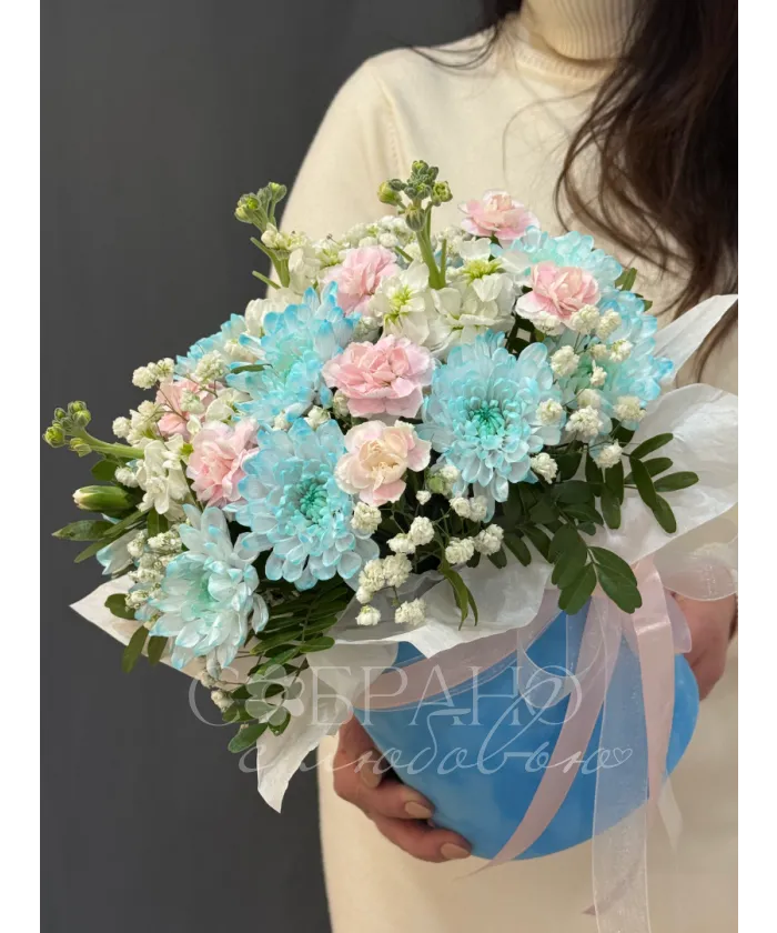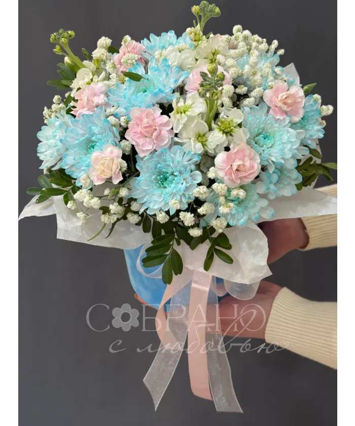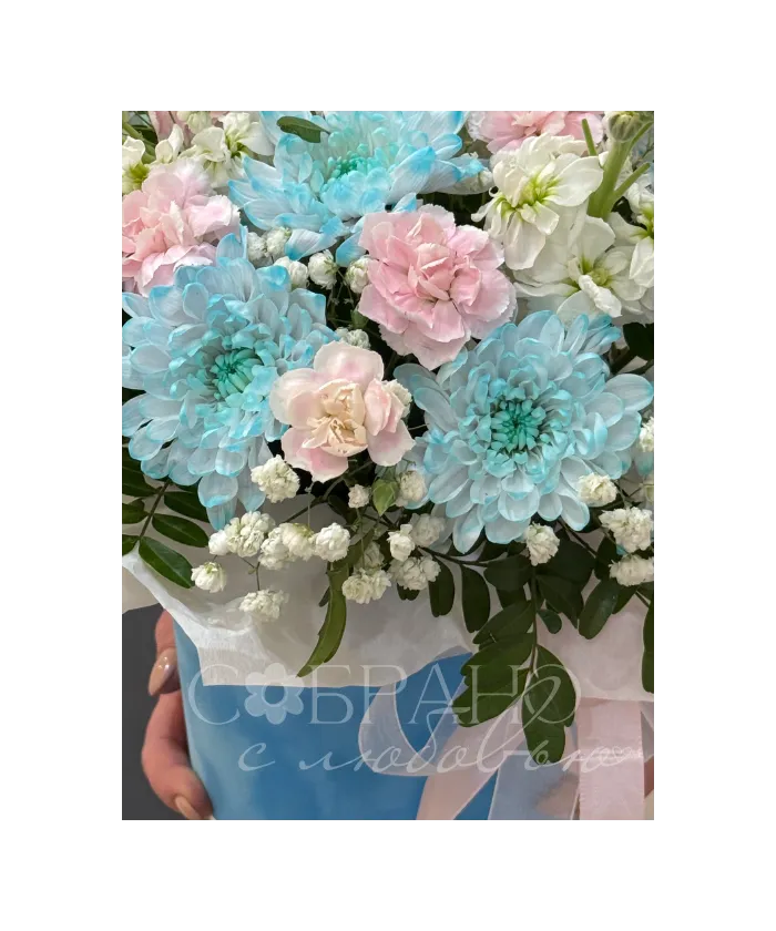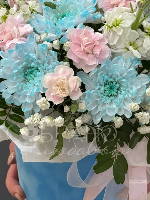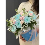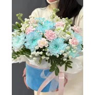 Вот краткое описание букета для каталога цветов: Нежный букет, словно овеянный легким дыханием весны, сочетает в себе ярко-голубые хризантемы, воздушную гипсофилу и деликатные розовые гвоздики. Эта композиция подарит ощущение свежести и подарит незабываемые эмоции.