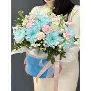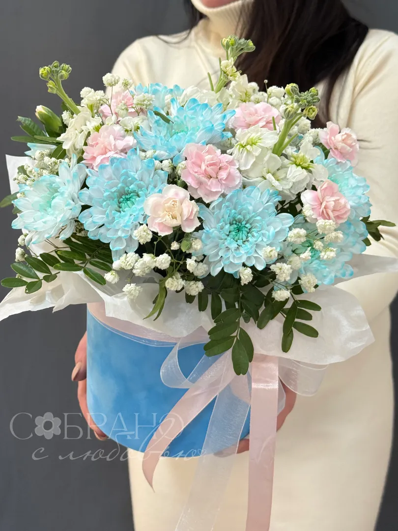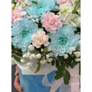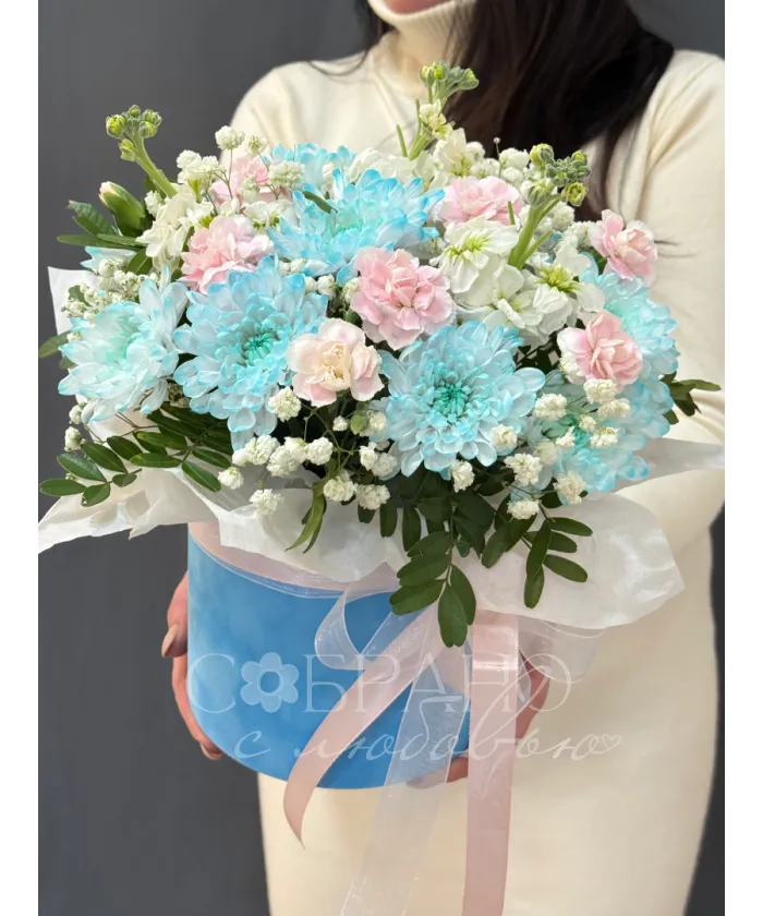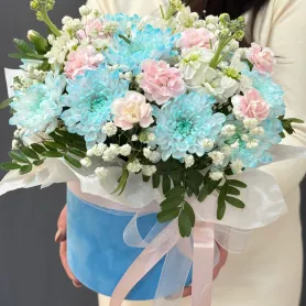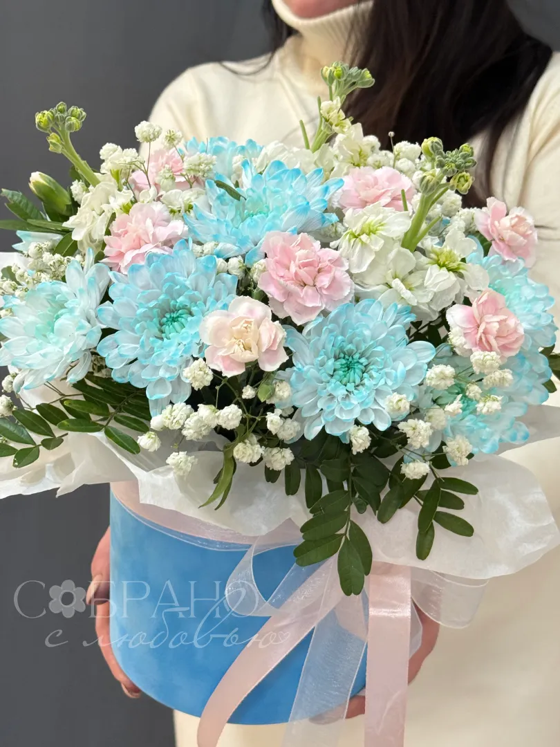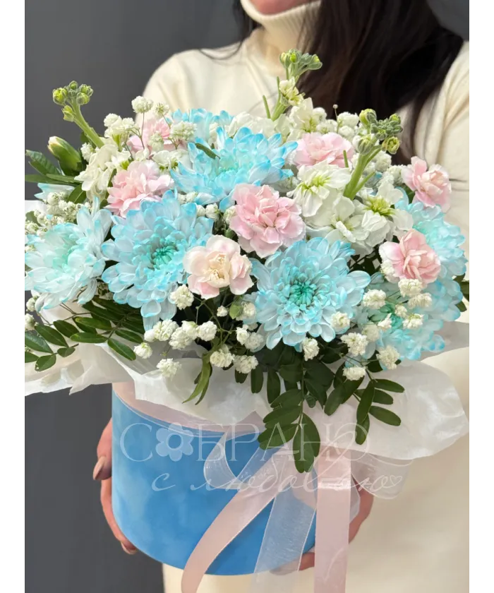 Вот краткое описание букета для каталога цветов: Нежный букет, словно овеянный легким дыханием весны, сочетает в себе ярко-голубые хризантемы, воздушную гипсофилу и деликатные розовые гвоздики. Эта композиция подарит ощущение свежести и подарит незабываемые эмоции.