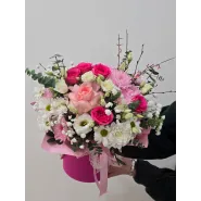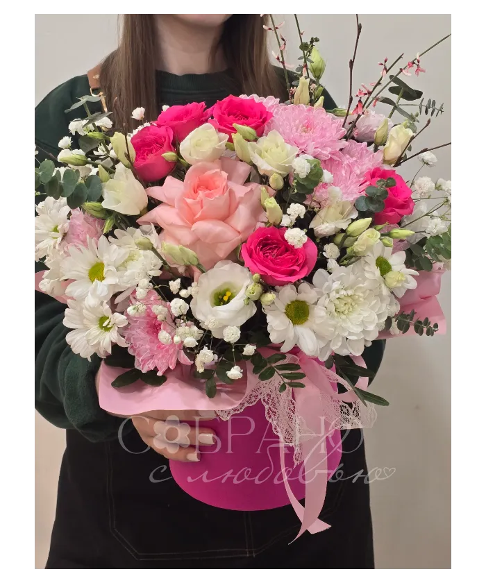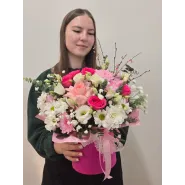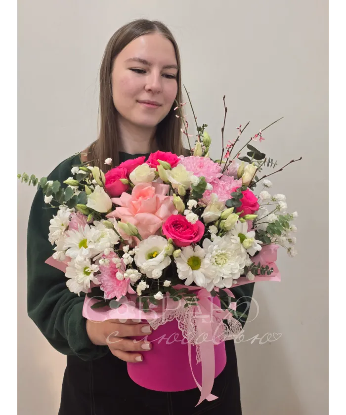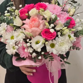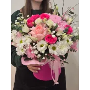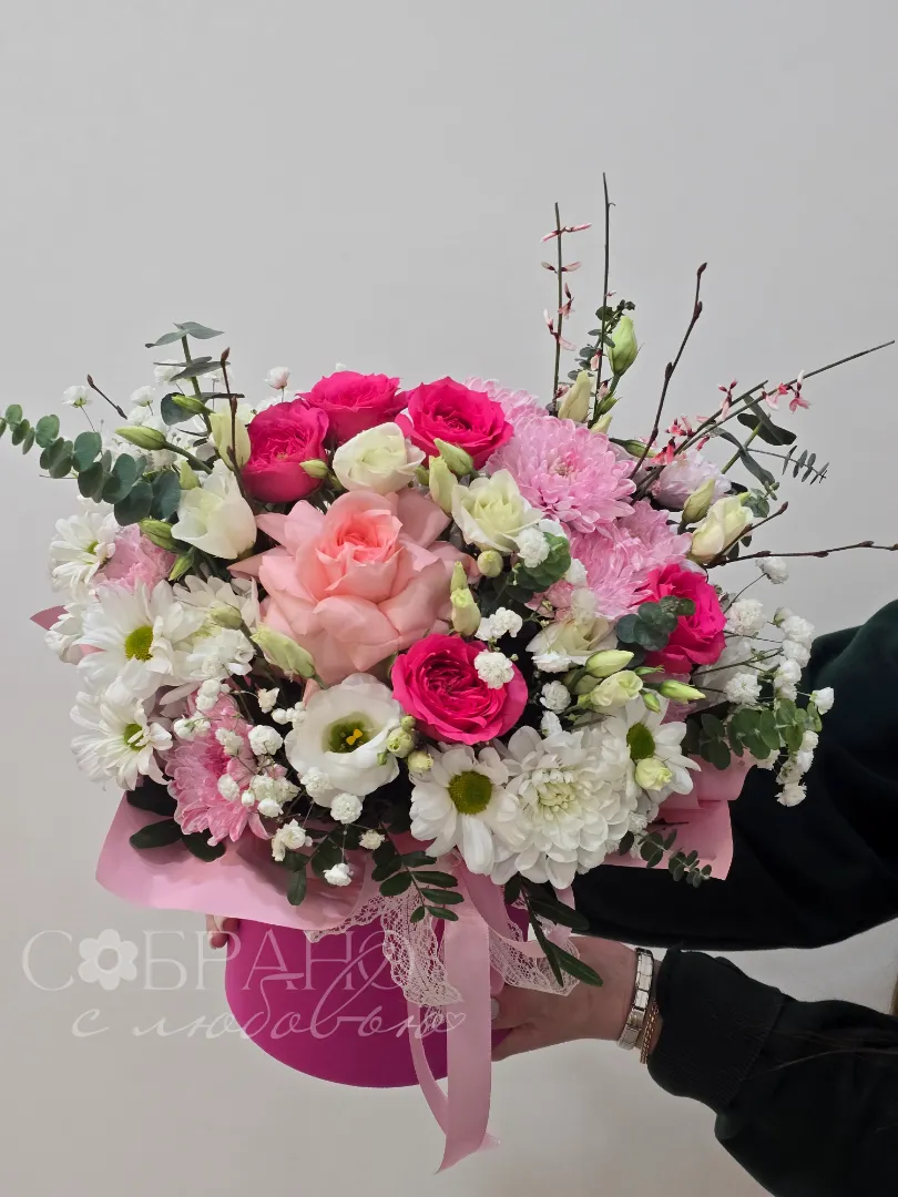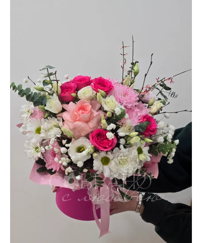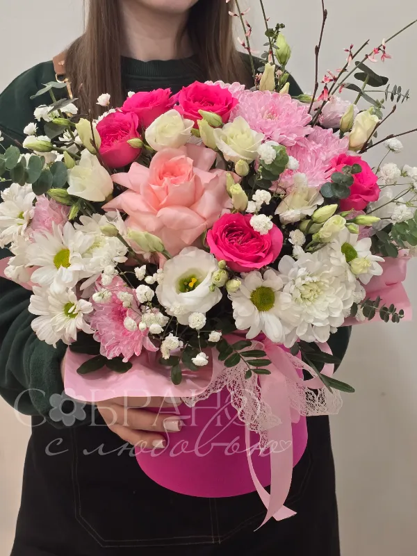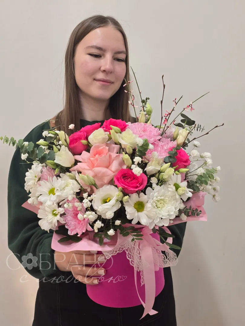 Нежный букет в стильной розовой шляпной коробке. Изящное сочетание роз, хризантем и эустомы, дополненное зеленью и гипсофилой, создаст атмосферу романтики и весеннего настроения. Этот букет станет прекрасным подарком на любой праздник, выражая чувства нежности и восхищения.