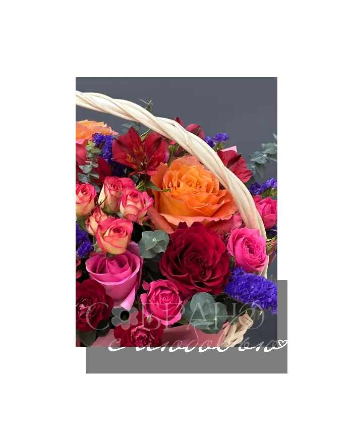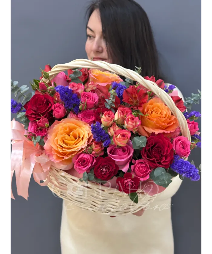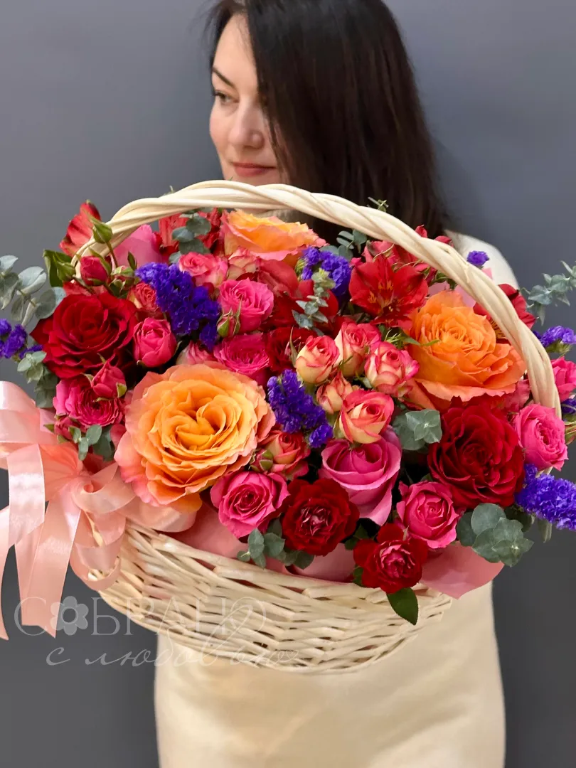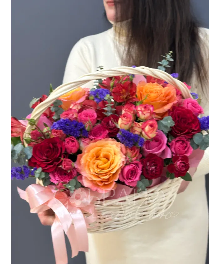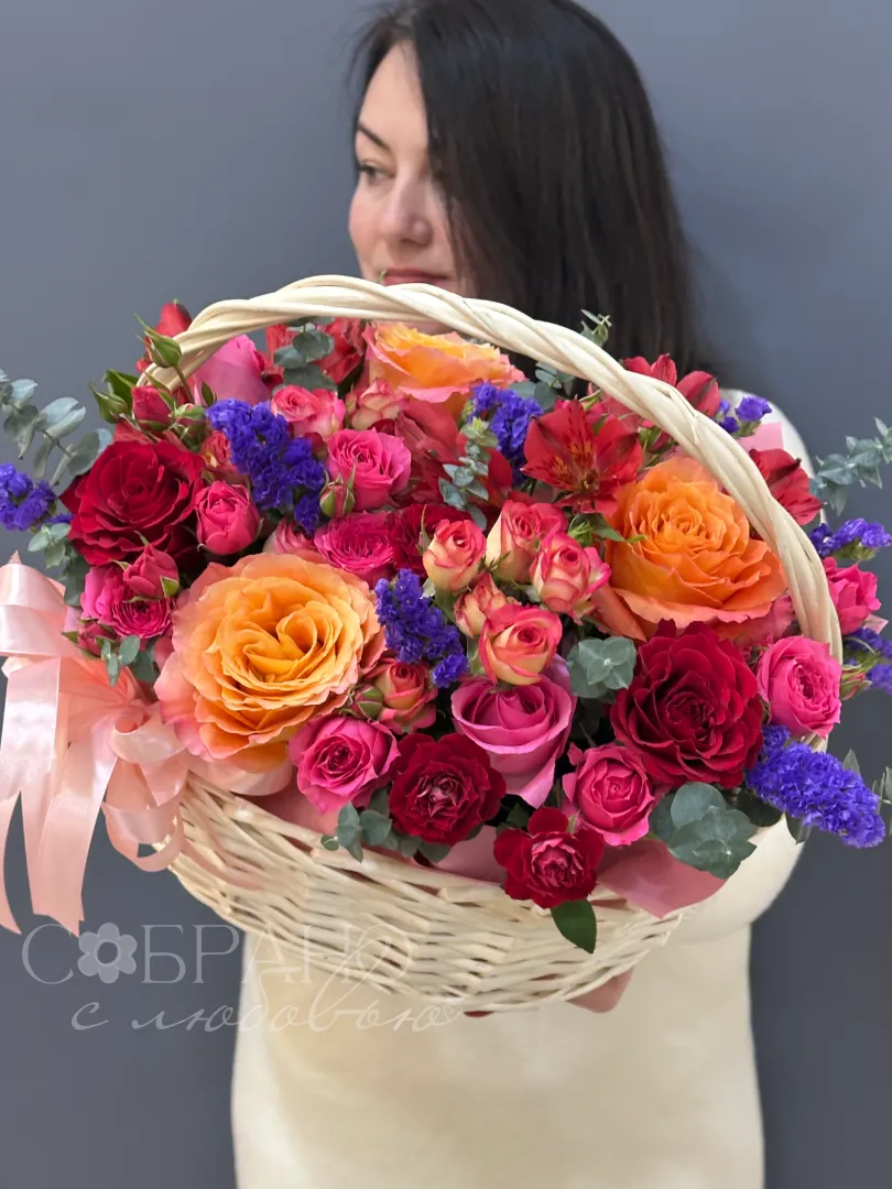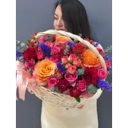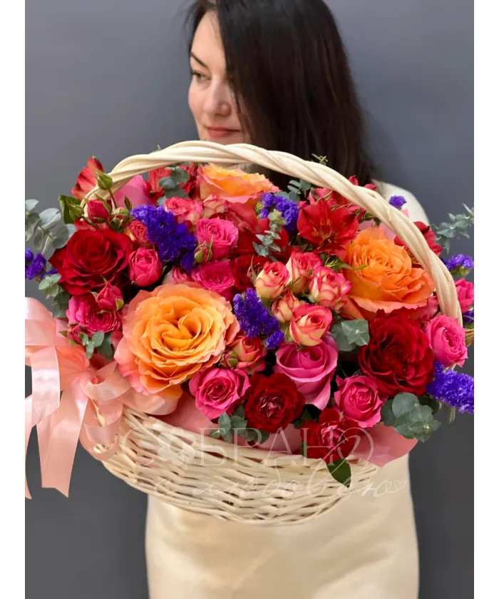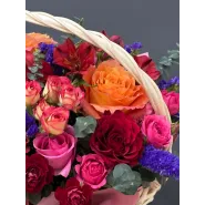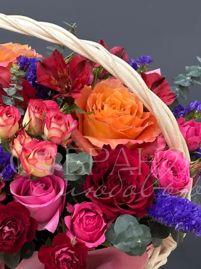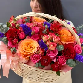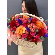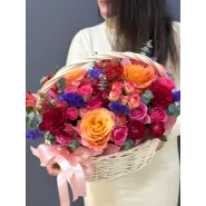 Этот роскошный букет в плетеной корзине настоящее буйство красок и эмоций. Сочетание ярких роз, нежных оттенков и оригинальных акцентов создает неповторимую композицию. Идеальный подарок, чтобы выразить гамму чувств и подарить незабываемые впечатления.