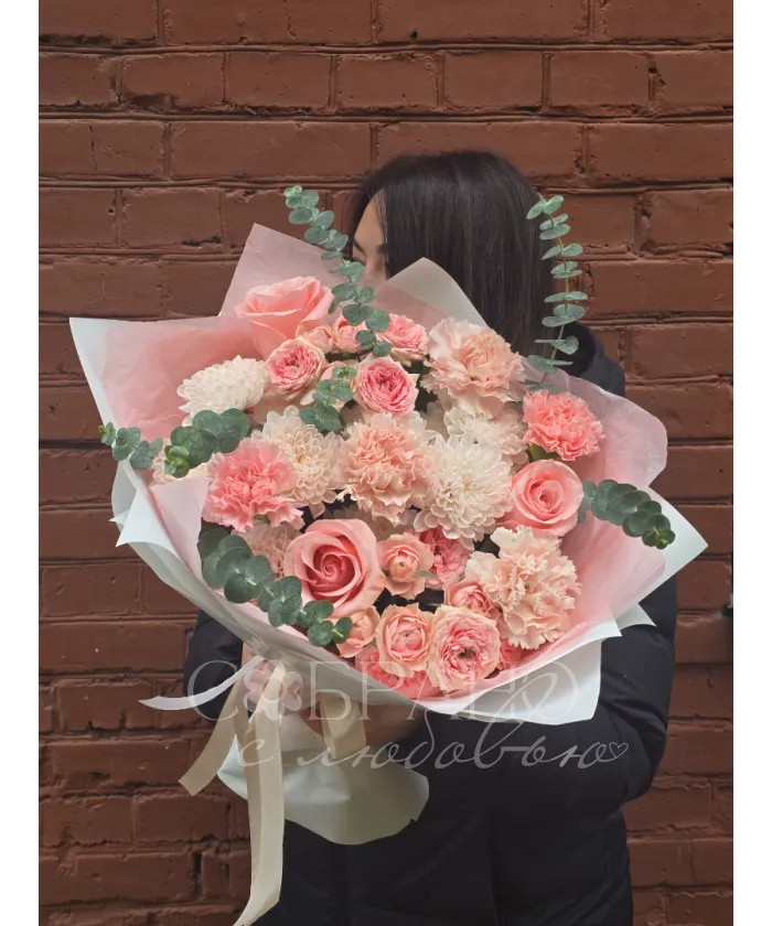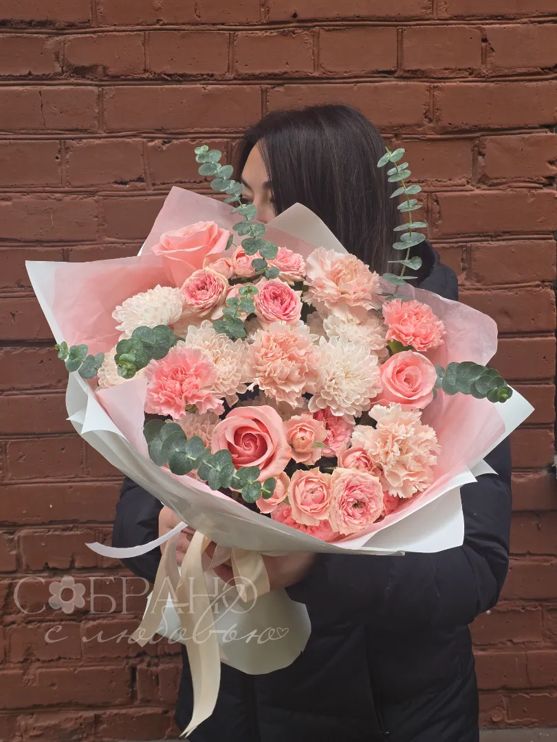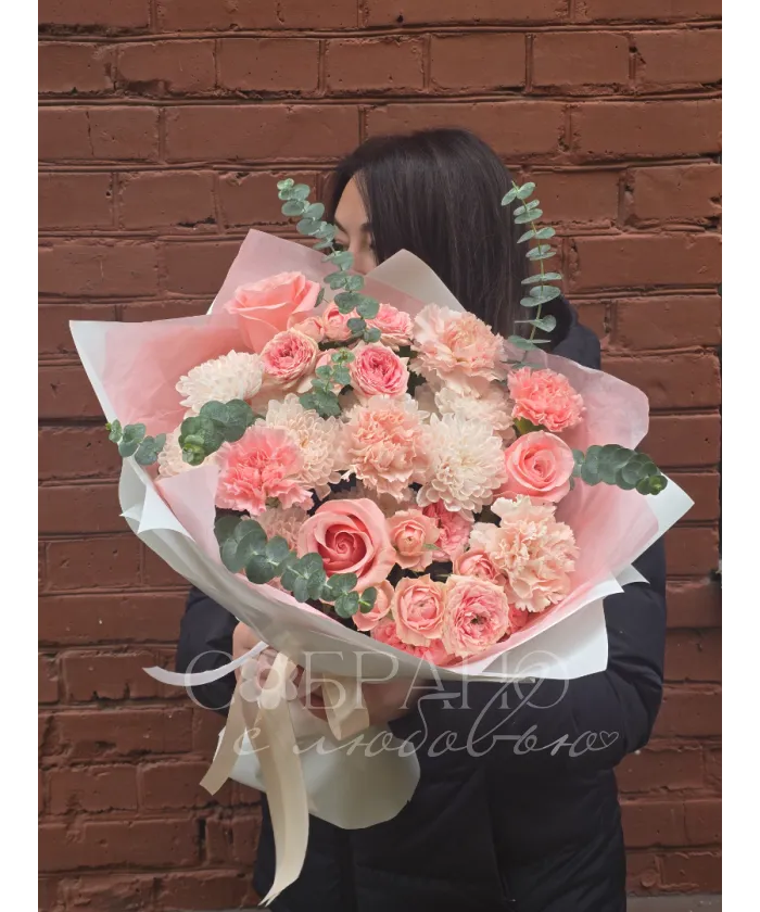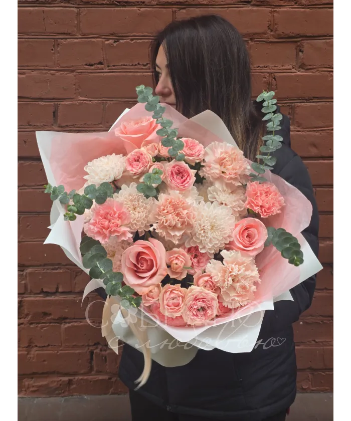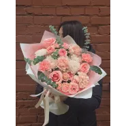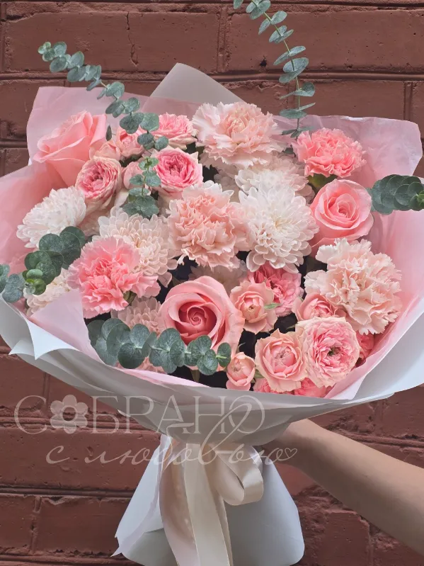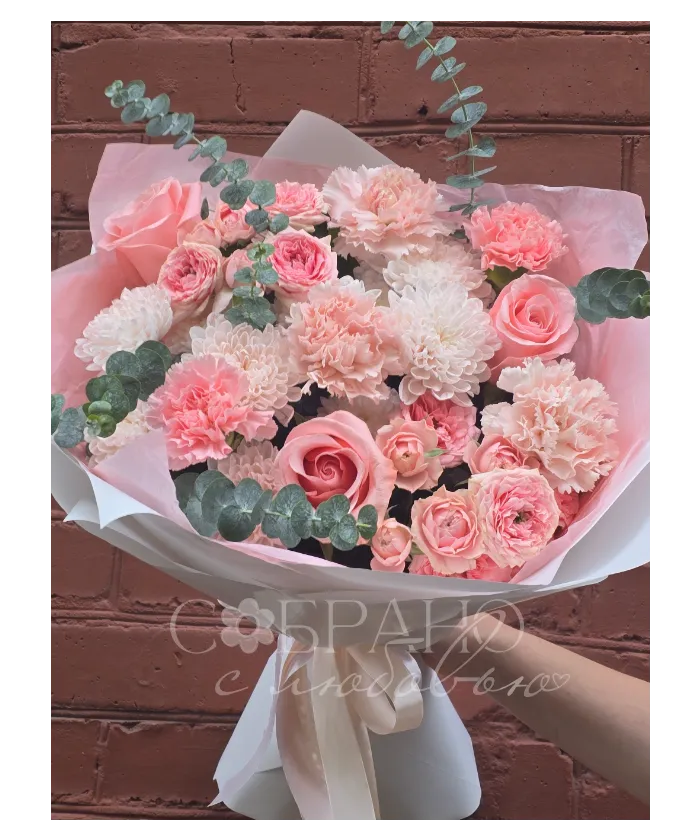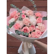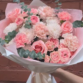 Нежность и очарование этого букета воплощены в трепетных розовых оттенках. Воздушные розы, пышные гвоздики и нежные хризантемы, дополненные зеленью эвкалипта, создают изысканную композицию, полную романтики и тепла. Этот букет станет идеальным выражением искренних чувств и подарит незабываемые моменты.