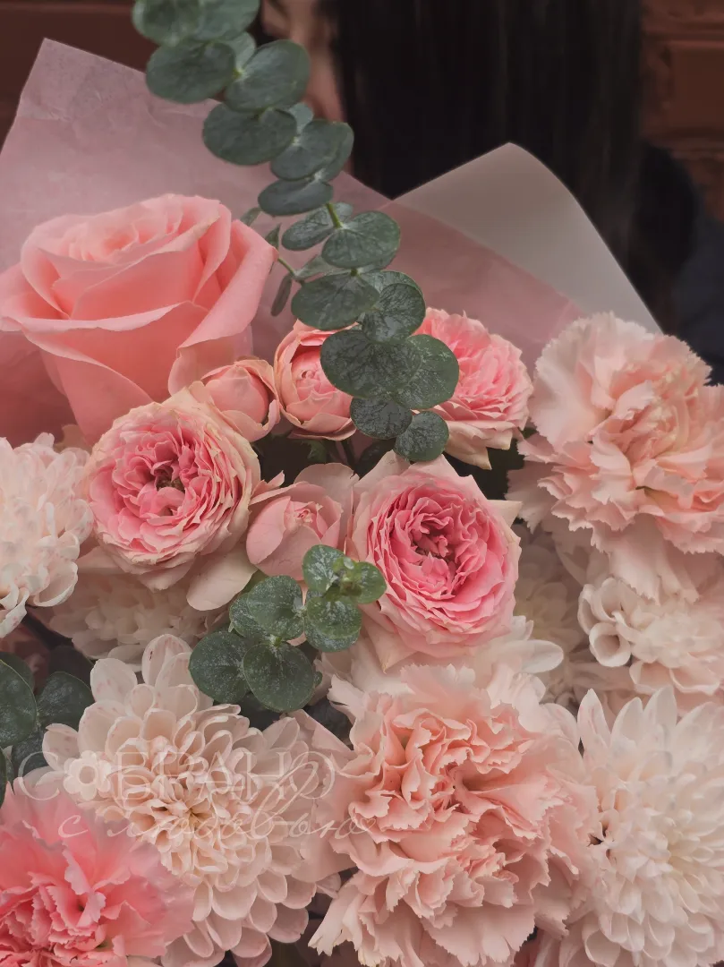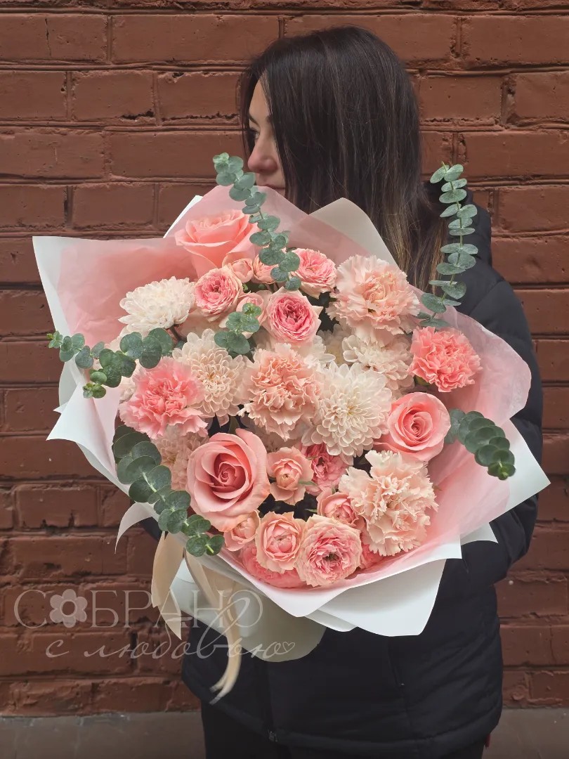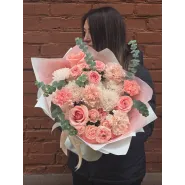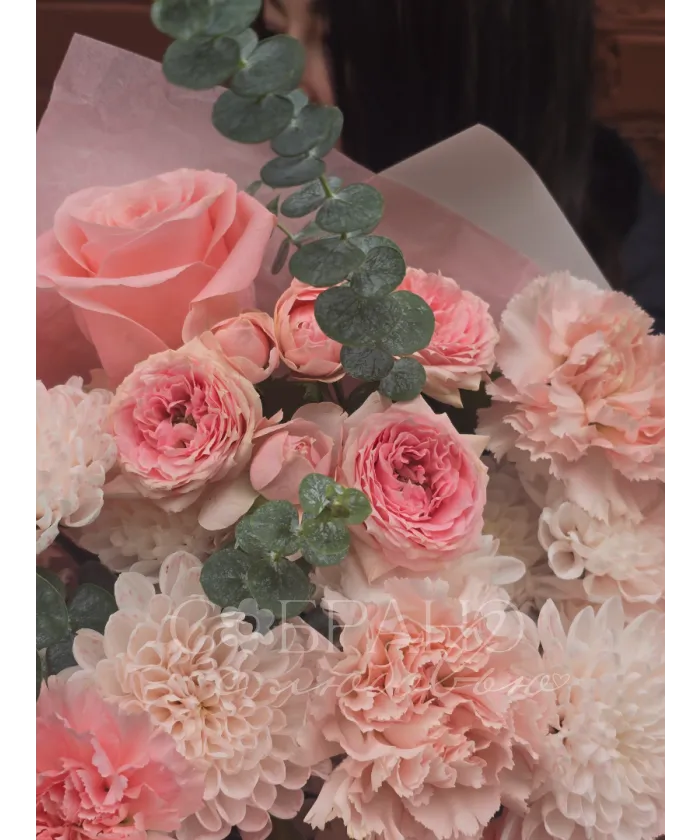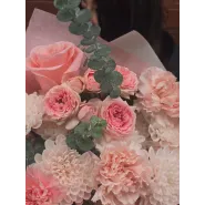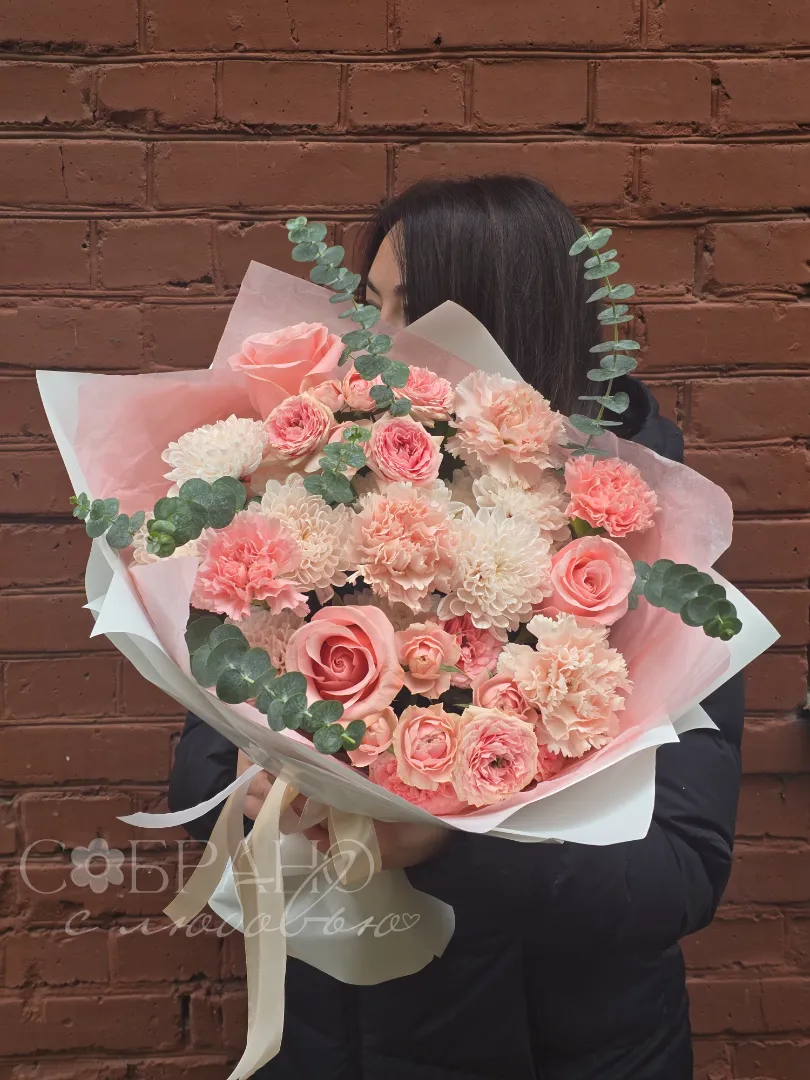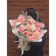 Нежность и очарование этого букета воплощены в трепетных розовых оттенках. Воздушные розы, пышные гвоздики и нежные хризантемы, дополненные зеленью эвкалипта, создают изысканную композицию, полную романтики и тепла. Этот букет станет идеальным выражением искренних чувств и подарит незабываемые моменты.