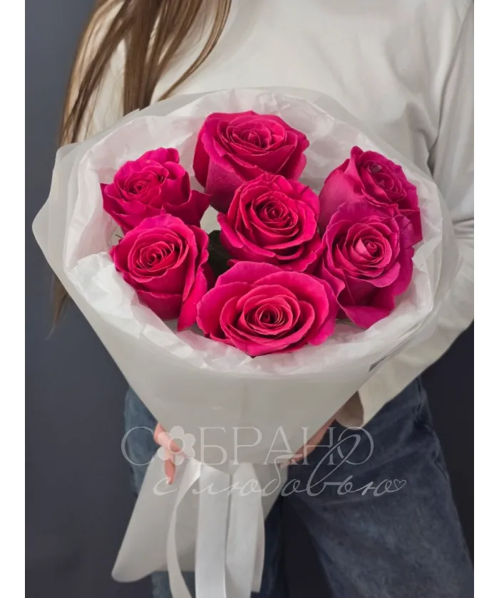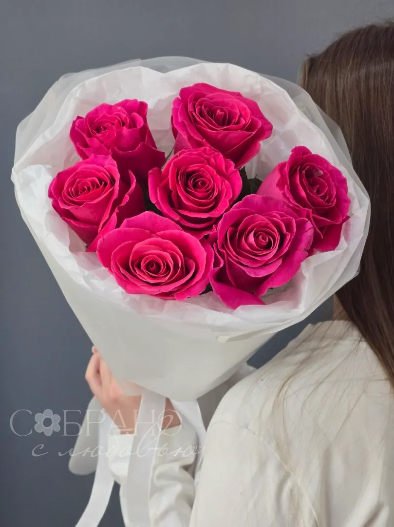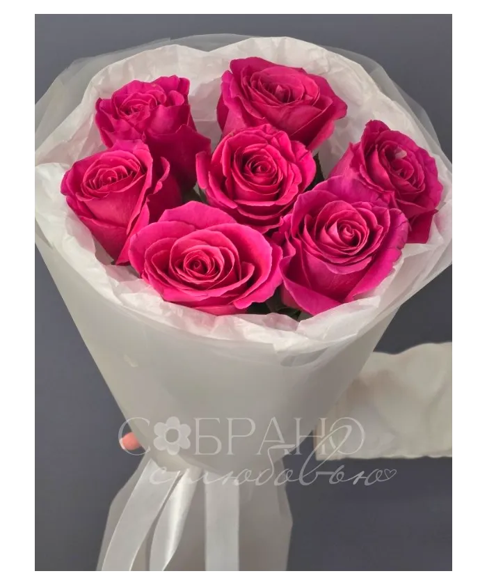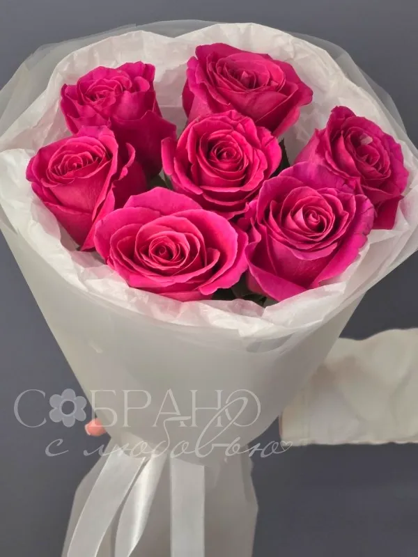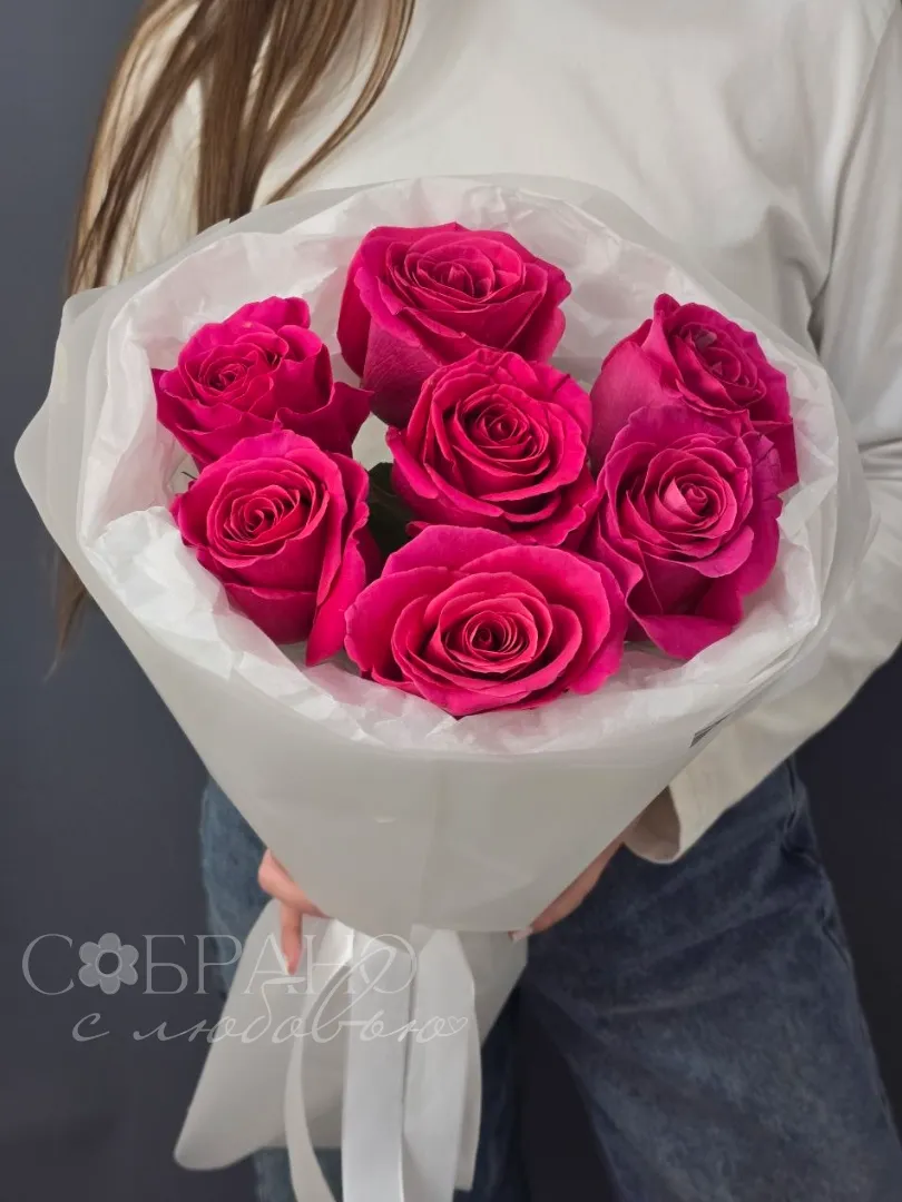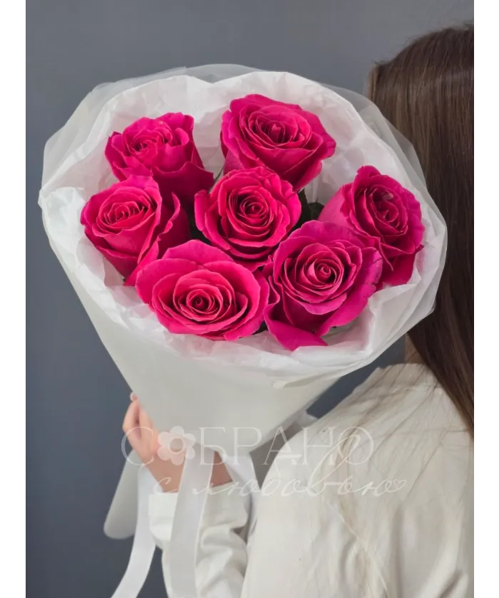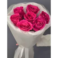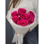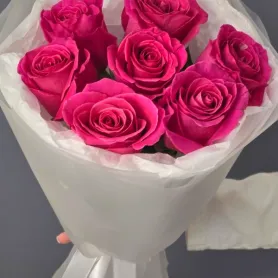Этот букет из ярко-розовых роз настоящее воплощение страсти и элегантности. Каждый цветок, как драгоценный камень, раскрывает свою неповторимую красоту. Идеальный комплимент, который скажет всё без слов.